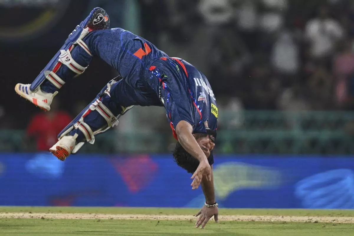 Mumbai Indians' Ashwani Kumar drops the catch of Punjab Kings' Prabhsimran Singh during the Indian Premier League cricket match between Punjab Kings and Mumbai Indians at Sawai Mansingh Stadium in Jaipur, India, Monday, May 26, 2025. (AP Photo/Surjeet Yadav)