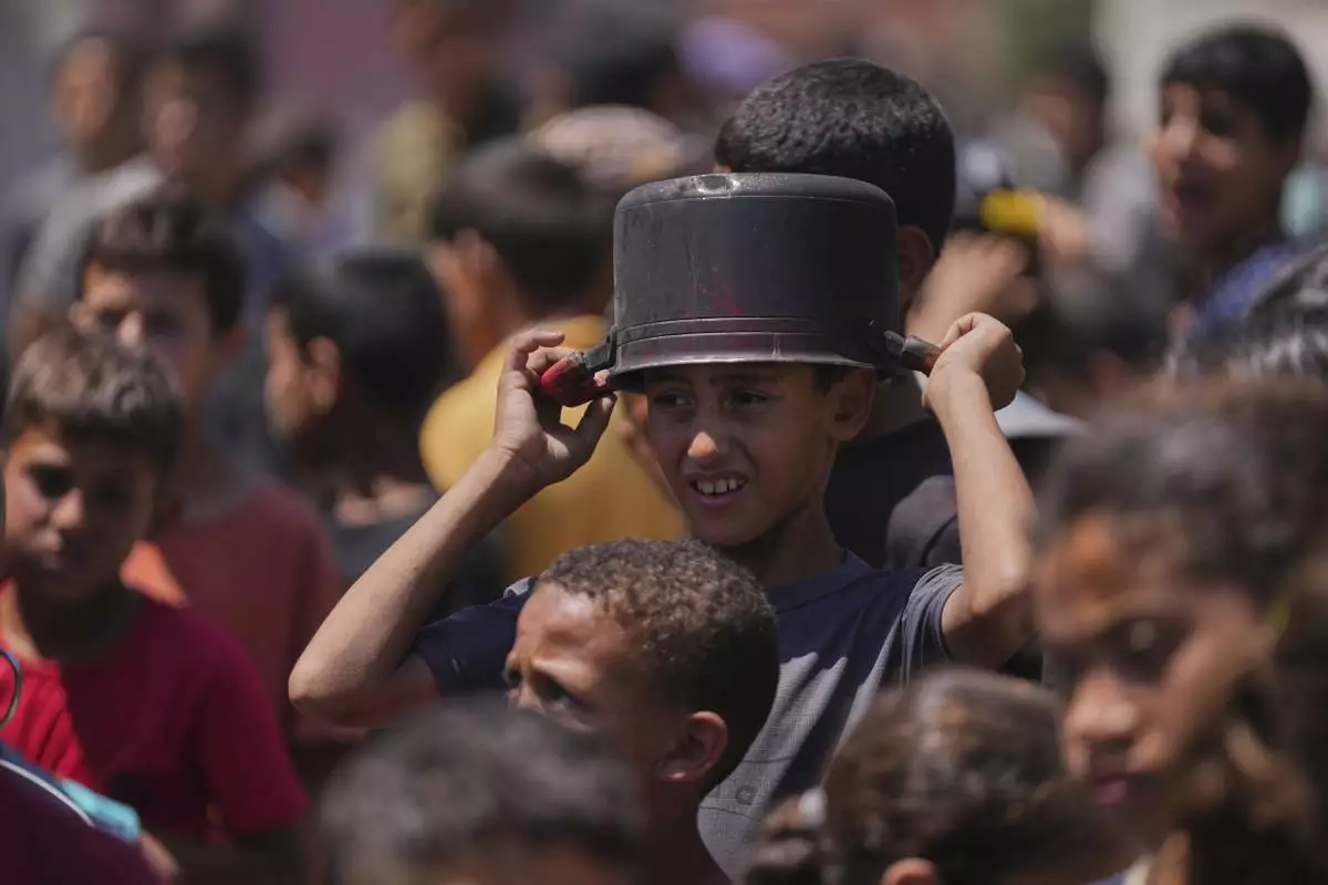 A young Palestinian waits to collect donated food at a food distribution kitchen in Deir al-Balah, Gaza Strip, Friday, May 30, 2025. (AP Photo/Abdel Kareem Hana)
