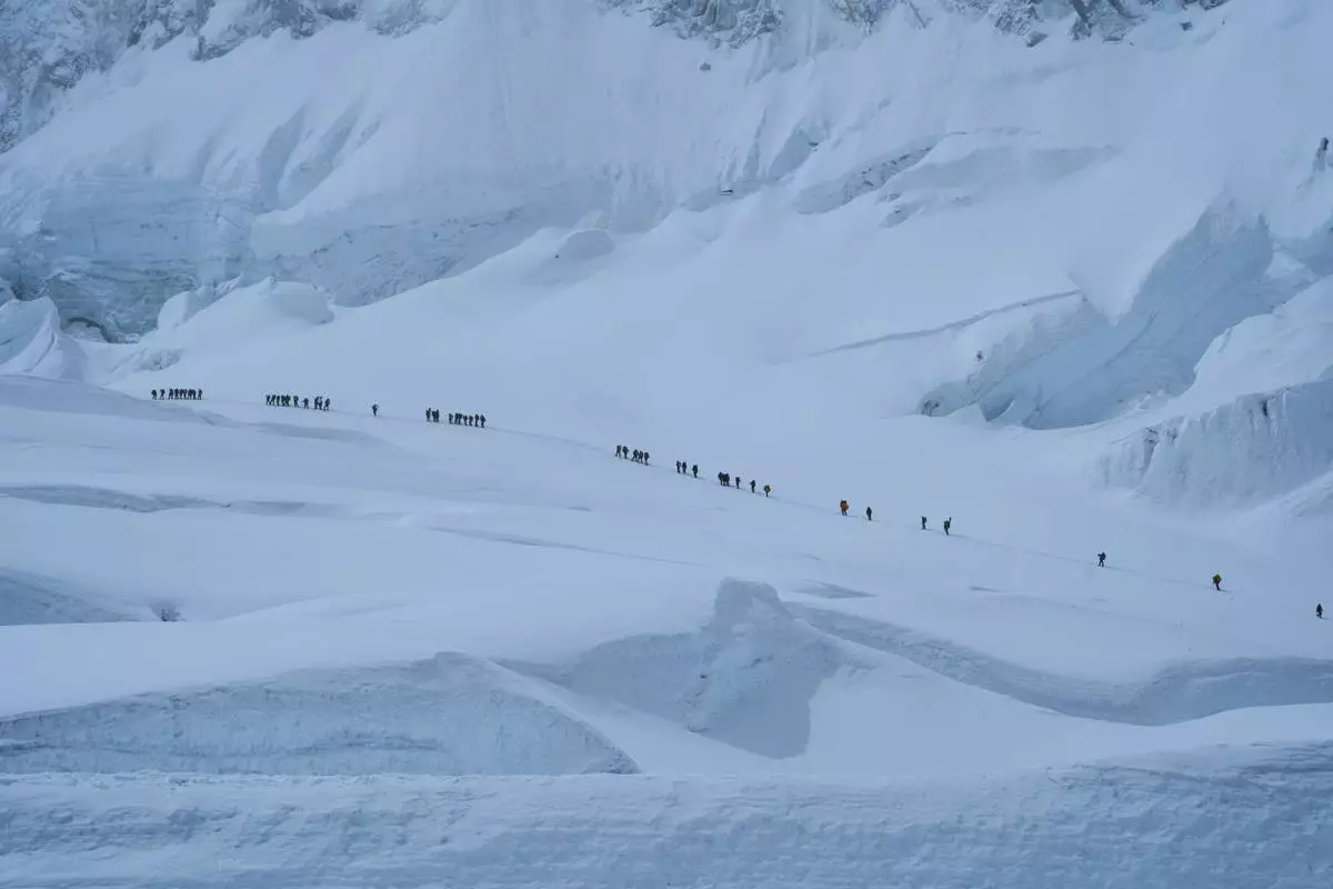 Mountaineers ascend to Camp 2 on their way to the summit of Mount Everest in Nepal, May 1, 2025. (AP Photo/Pasang Rinzee Sherpa)