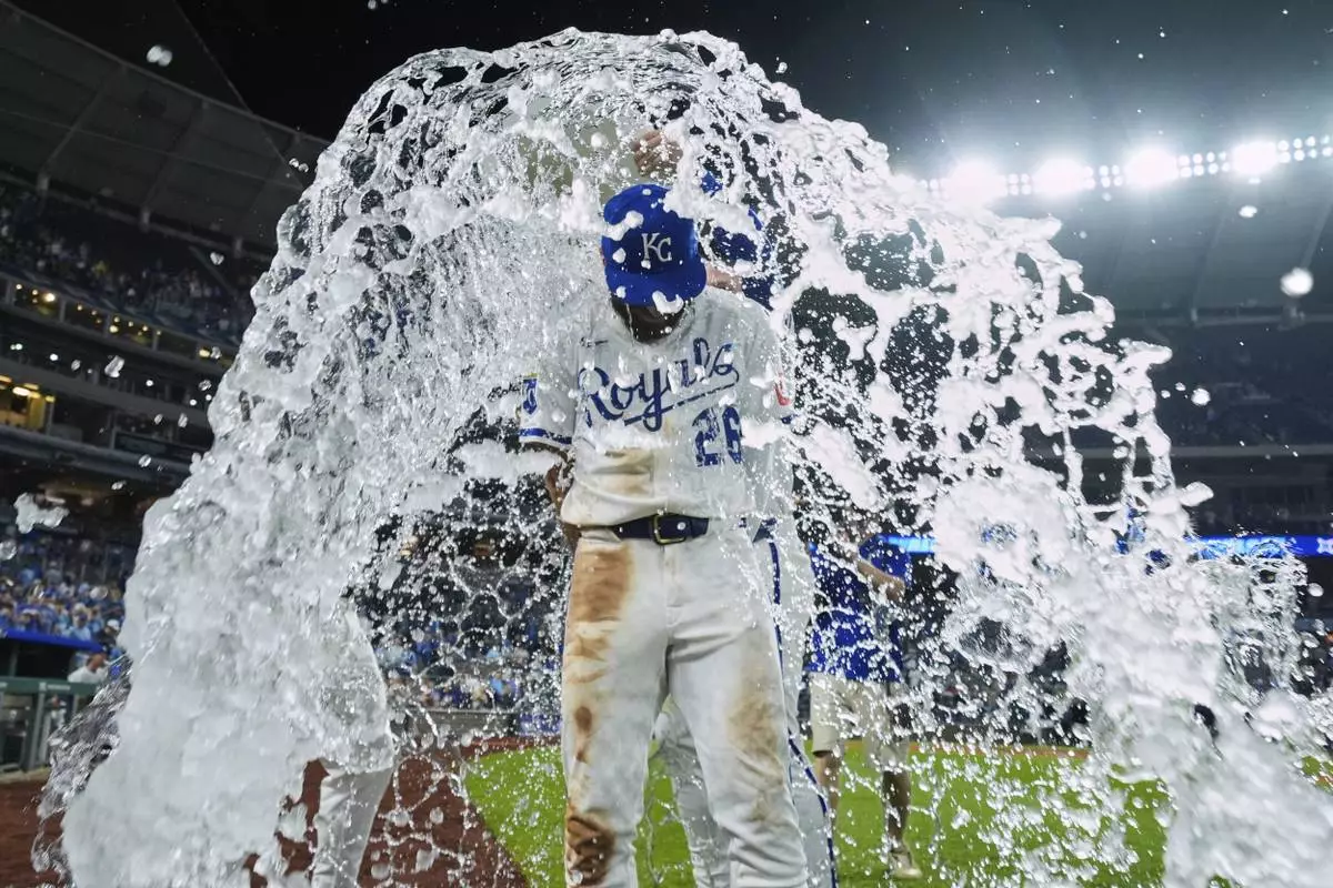 Kansas City Royals' John Rave is doused by teammates after their baseball game against the Cincinnati Reds, Wednesday, May 28, 2025, in Kansas City, Mo. (AP Photo/Charlie Riedel)