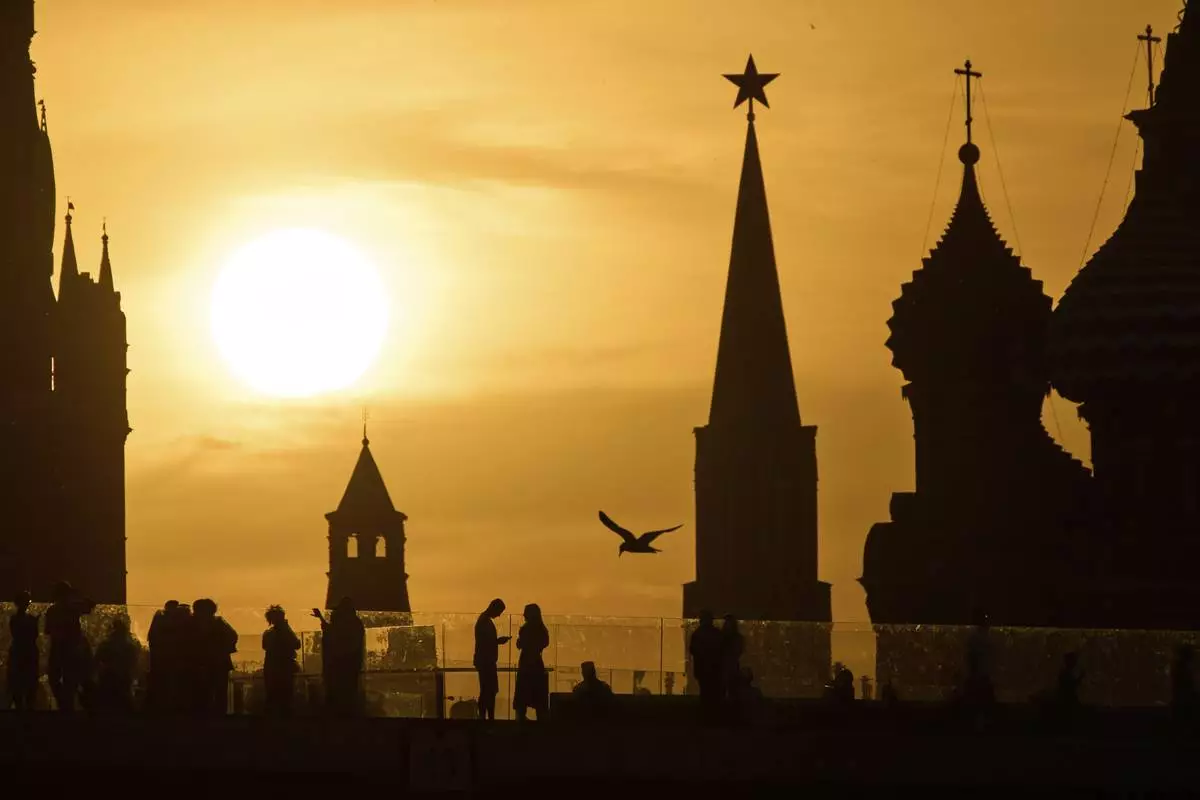 People watch the sunset behind the Kremlin standing on the "Flying glass bridge" over the Moscow River at Zaryadye park in Moscow, Russia, Thursday, May 29, 2025. (AP Photo/Alexander Zemlianichenko)