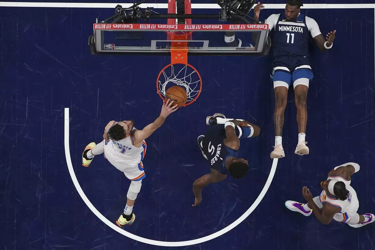 Oklahoma City Thunder forward Chet Holmgren (7) dunks next to Minnesota Timberwolves guard Anthony Edwards (5) and center Naz Reid (11) during the second half of Game 4 of the Western Conference finals of the NBA basketball playoffs, Monday, May 26, 2025, in Minneapolis. (AP Photo/Abbie Parr)