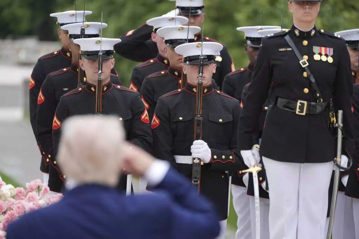 President Donald Trump salutes during a Memorial Day wreath laying ceremony at Arlington National Cemetery, in Arlington, Va., Monday, May 26, 2025. (AP Photo/Jacquelyn Martin)