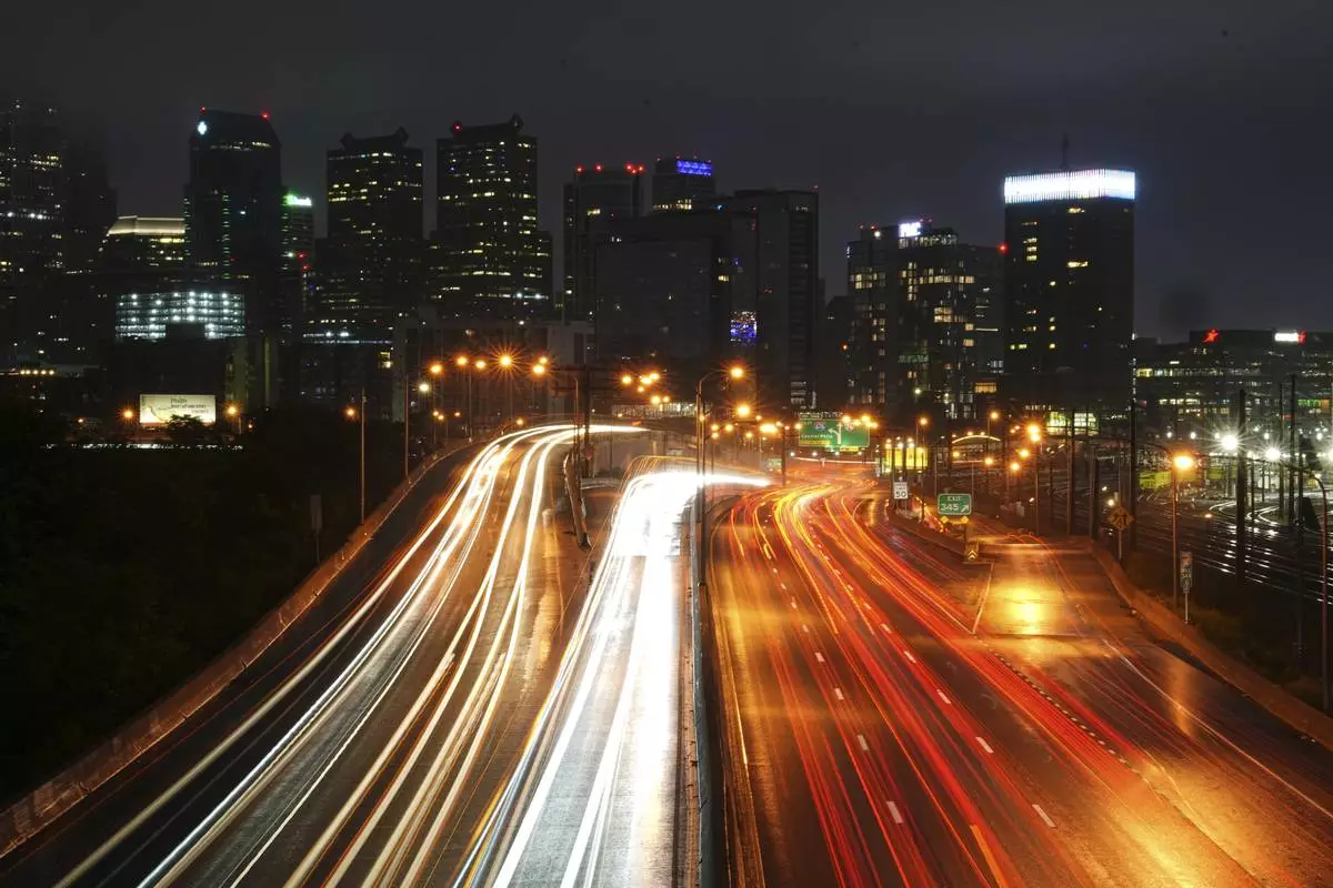 In this long exposure photograph traffic moves along Interstate 76 ahead of the Memorial Day holiday weekend, in Philadelphia, Thursday, May 22, 2025. (AP Photo/Matt Rourke)