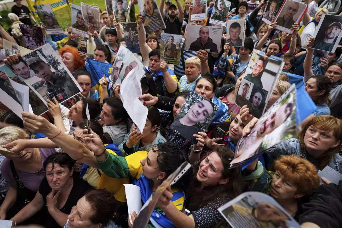 People show photos of their missed relatives to Ukrainian soldiers during a POWs exchange between Russia and Ukraine, in Chernyhiv region, Ukraine, Saturday, May 24, 2025. (AP Photo/Evgeniy Maloletka)