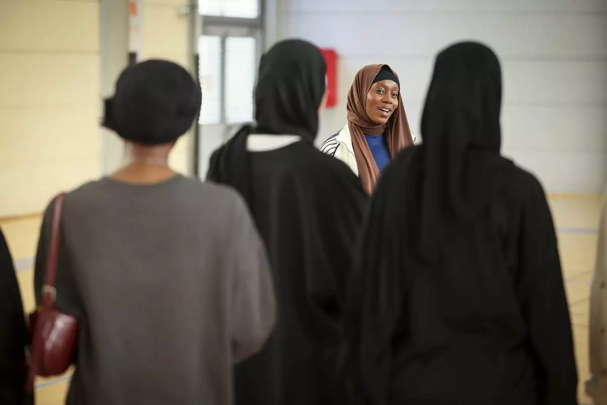 Former player Salimata Sylla welcomes players before a women's basketball tournament where players can wear a headscarf, in Aubervilliers near Paris, Sunday, April 27, 2025. (AP Photo/Thomas Padilla)