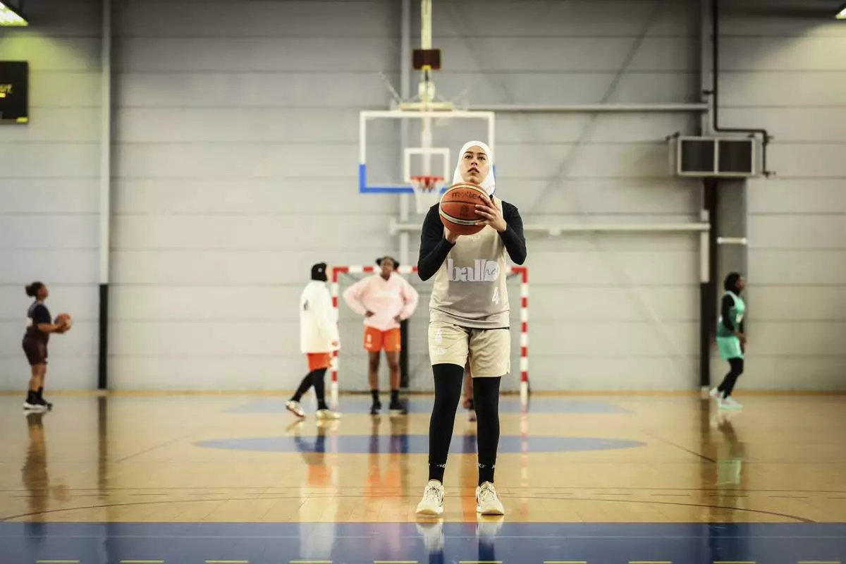A player wearing a headscarf warms-up before a basketball game, in Aubervilliers near Paris, Sunday, April 27, 2025. (AP Photo/Thomas Padilla)