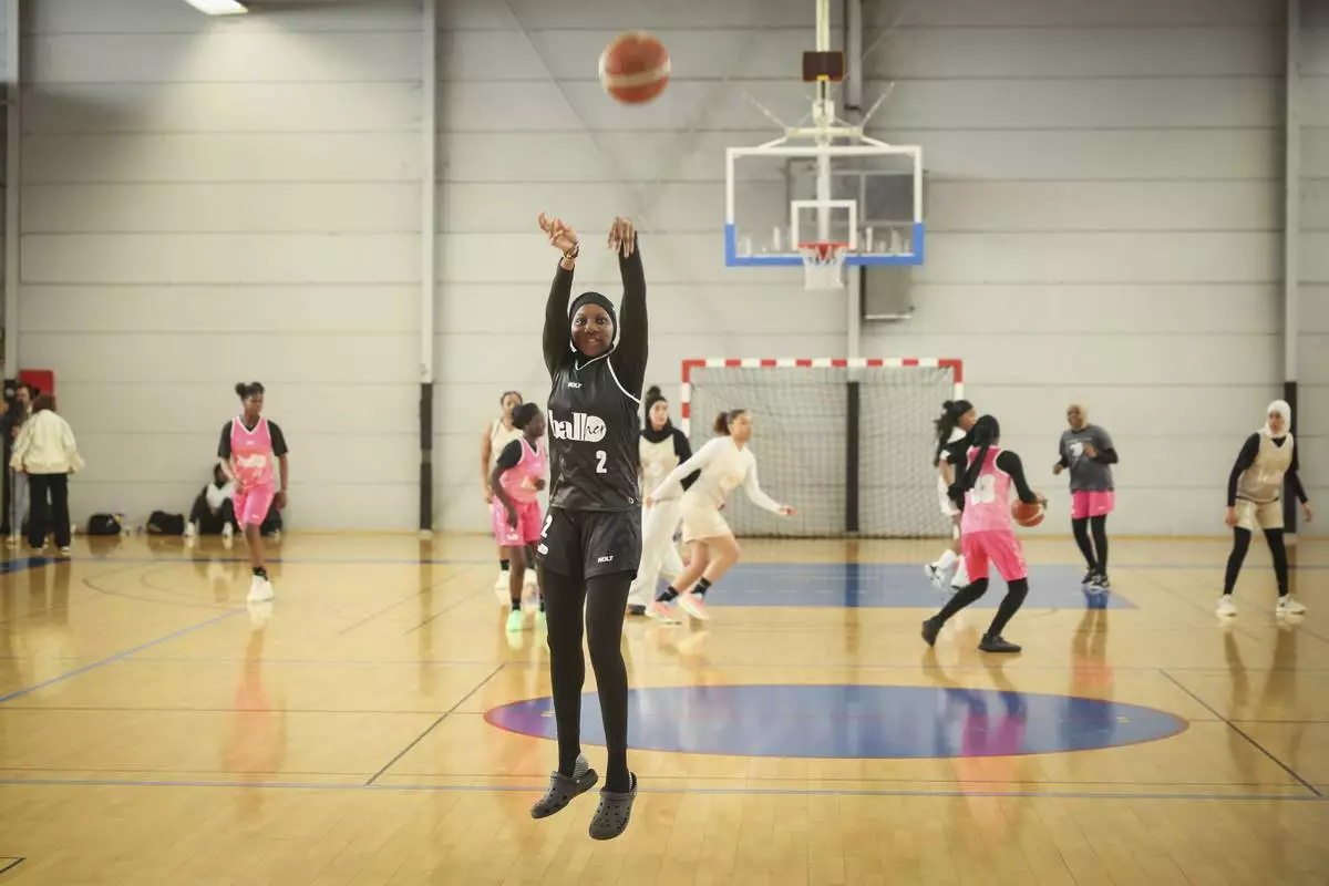 Former player Salimata Sylla poses before a women's basketball tournament where players can wear a headscarf, in Aubervilliers near Paris, Sunday, April 27, 2025. (AP Photo/Thomas Padilla)