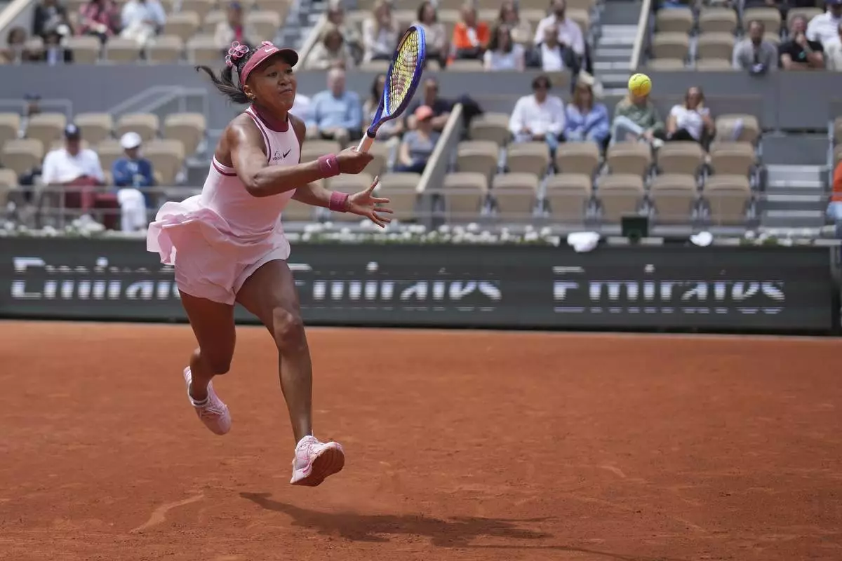 Japan's Naomi Osaka returns the ball to Spain's Paula Badosa during their first round match of the French Tennis Open, at the Roland-Garros stadium, in Paris, Monday, May 26, 2025. (AP Photo/Christophe Ena)