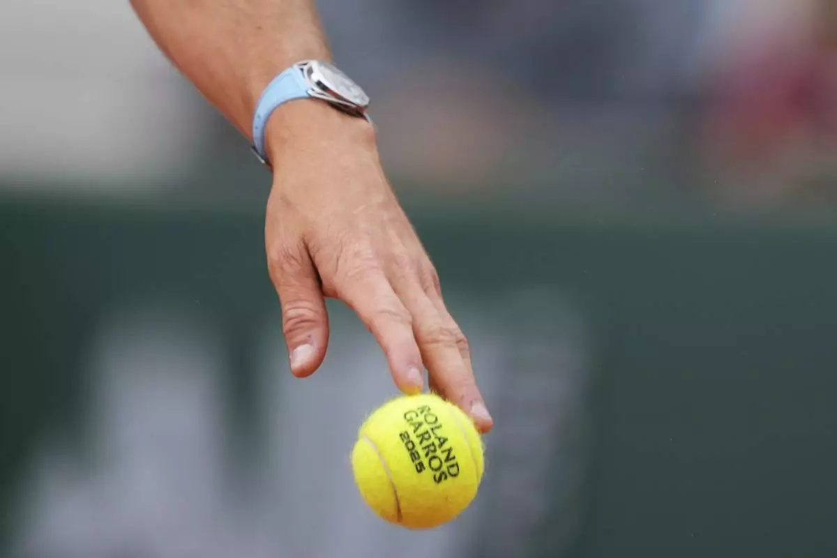 A ball boy reaches for a ball during the first round match of the French Tennis Open between Poland's Iga Swiatek and Slovakia's Rebecca Sramkova, at the Roland-Garros stadium, in Paris, Monday, May 26, 2025. (AP Photo/Lindsey Wasson)