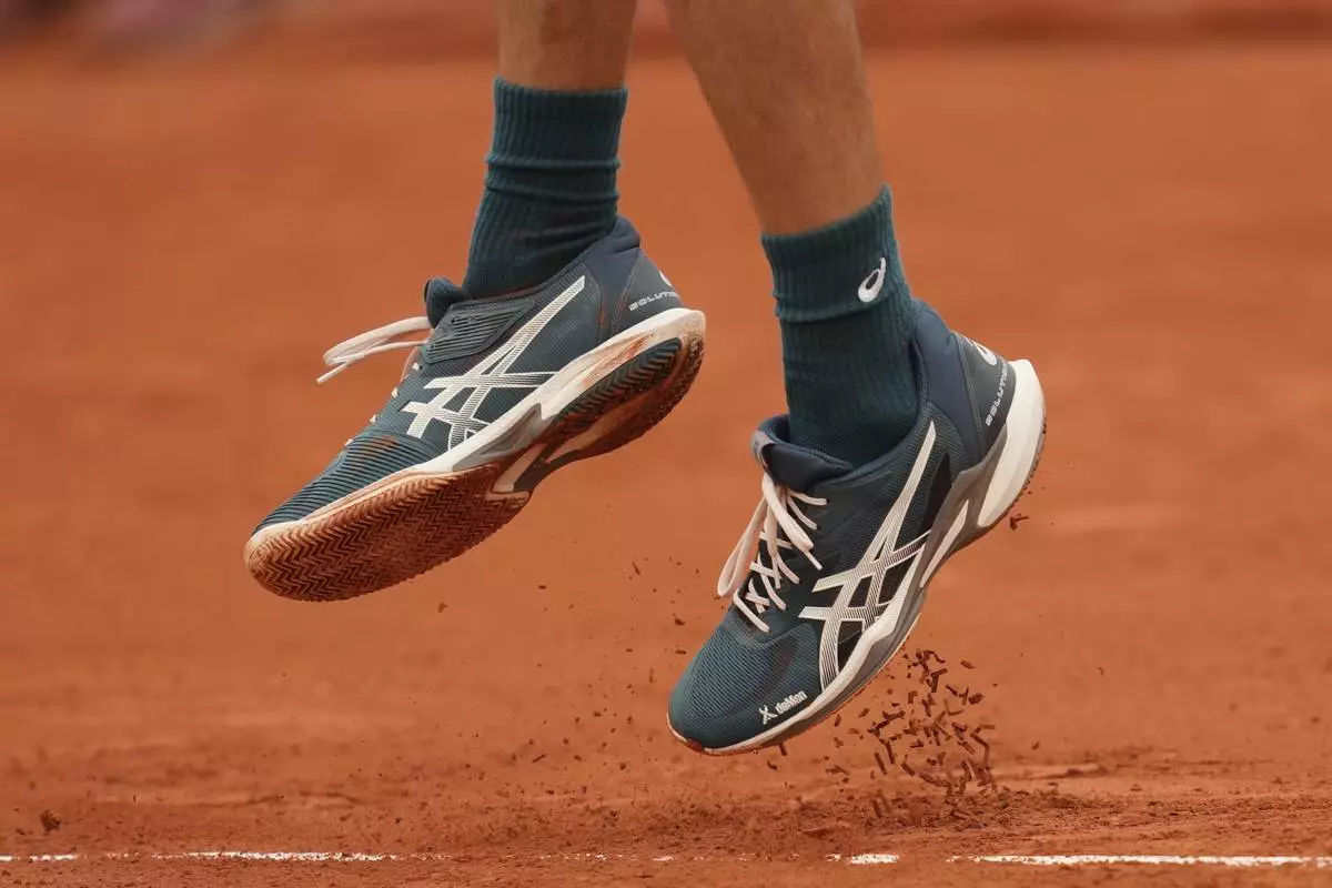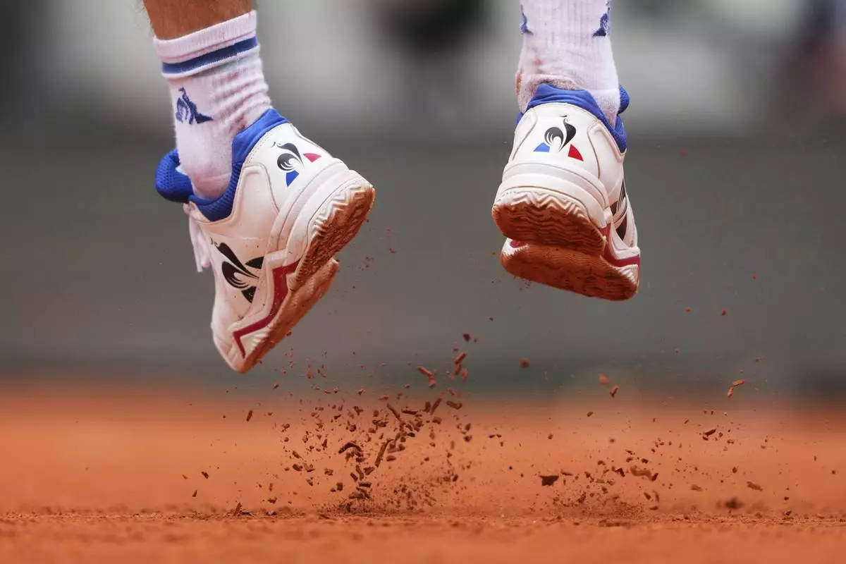 France's Terence Atmane kicks the clay as he serves against France's Richard Gasquet during their first round match of the French Tennis Open, at the Roland-Garros stadium, in Paris, Monday, May 26, 2025. (AP Photo/Lindsey Wasson)