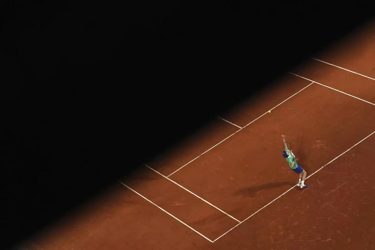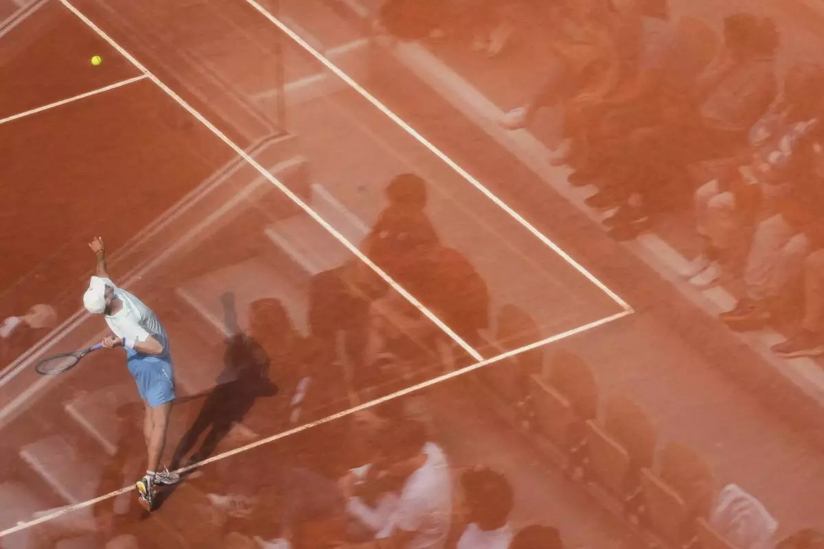 Germany's Yannick Hanfmann is reflected in a glass as he serves against Italy's Lorenzo Musetti during their first round match of the French Tennis Open at the Roland Garros stadium, in Paris, Sunday May 25, 2025. (AP Photo/Lindsey Wasson)