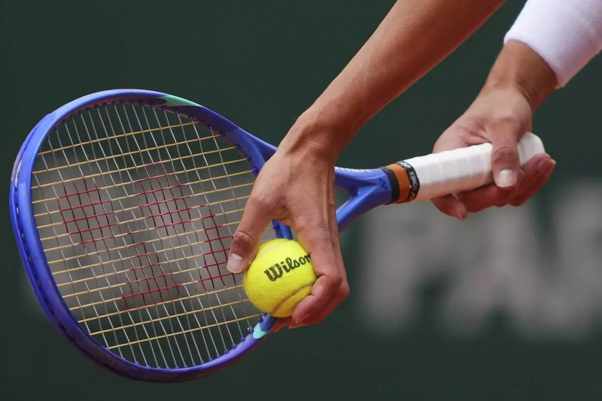 Slovakia's Rebecca Sramkova is reflected in a glass as she plays Poland's Iga Swiatek during their first round match of the French Tennis Open, at the Roland-Garros stadium, in Paris, Monday, May 26, 2025. (AP Photo/Lindsey Wasson)