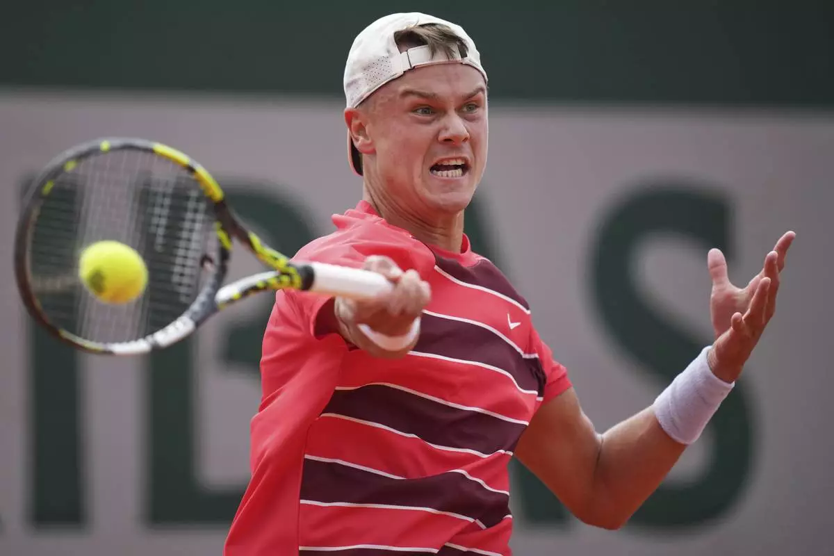 Denmark's Holger Rune returns the ball to Spain's Roberto Bautista Agut during their first round match of the French Tennis Open, at the Roland-Garros stadium, in Paris, Monday, May 26, 2025. (AP Photo/Christophe Ena)