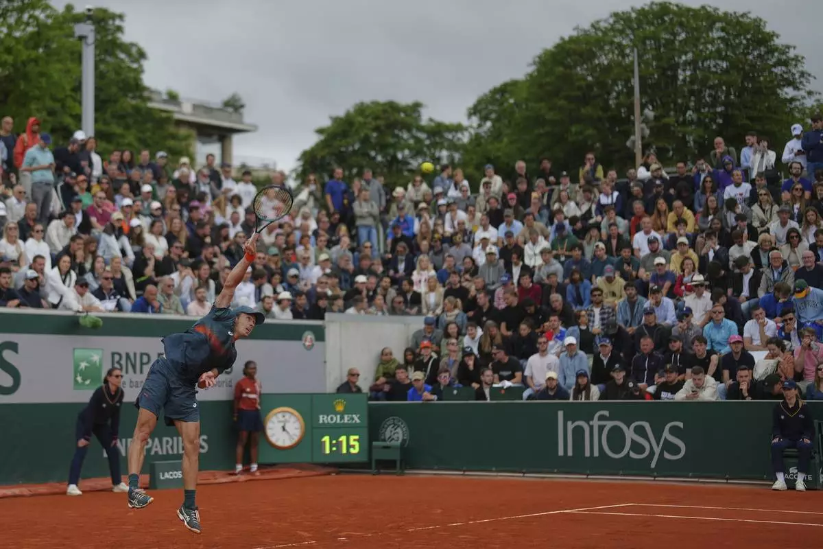 Germany's Daniel Altmaier prepares to serve against Taylor Fritz of the U.S. during their first round match of the French Tennis Open, at the Roland-Garros stadium, in Paris, Monday, May 26, 2025. (AP Photo/Lindsey Wasson)