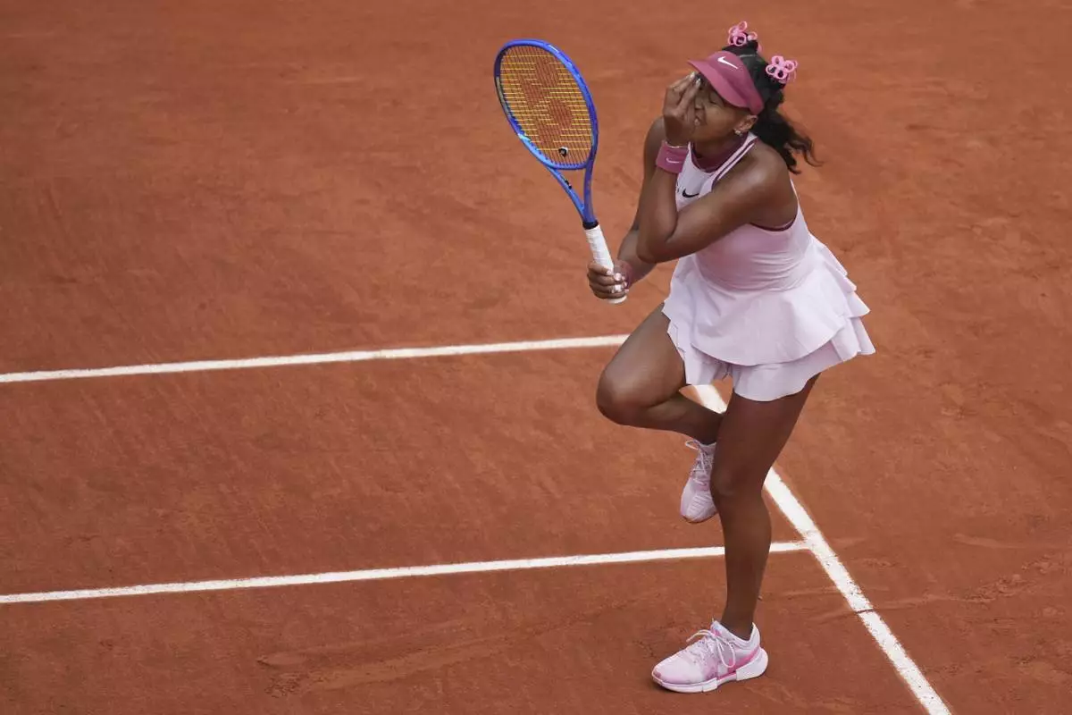 Japan's Naomi Osaka reacts as she plays Spain's Paula Badosa during their first round match of the French Tennis Open, at the Roland-Garros stadium, in Paris, Monday, May 26, 2025. (AP Photo/Christophe Ena)