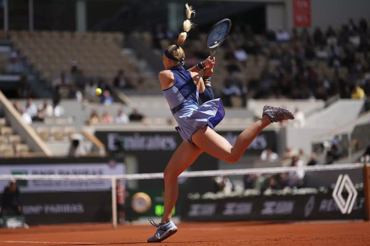 Slovakia's Rebecca Sramkova returns the ball to Poland's Iga Swiatek during their first round match of the French Tennis Open, at the Roland-Garros stadium, in Paris, Monday, May 26, 2025. (AP Photo/Lindsey Wasson)