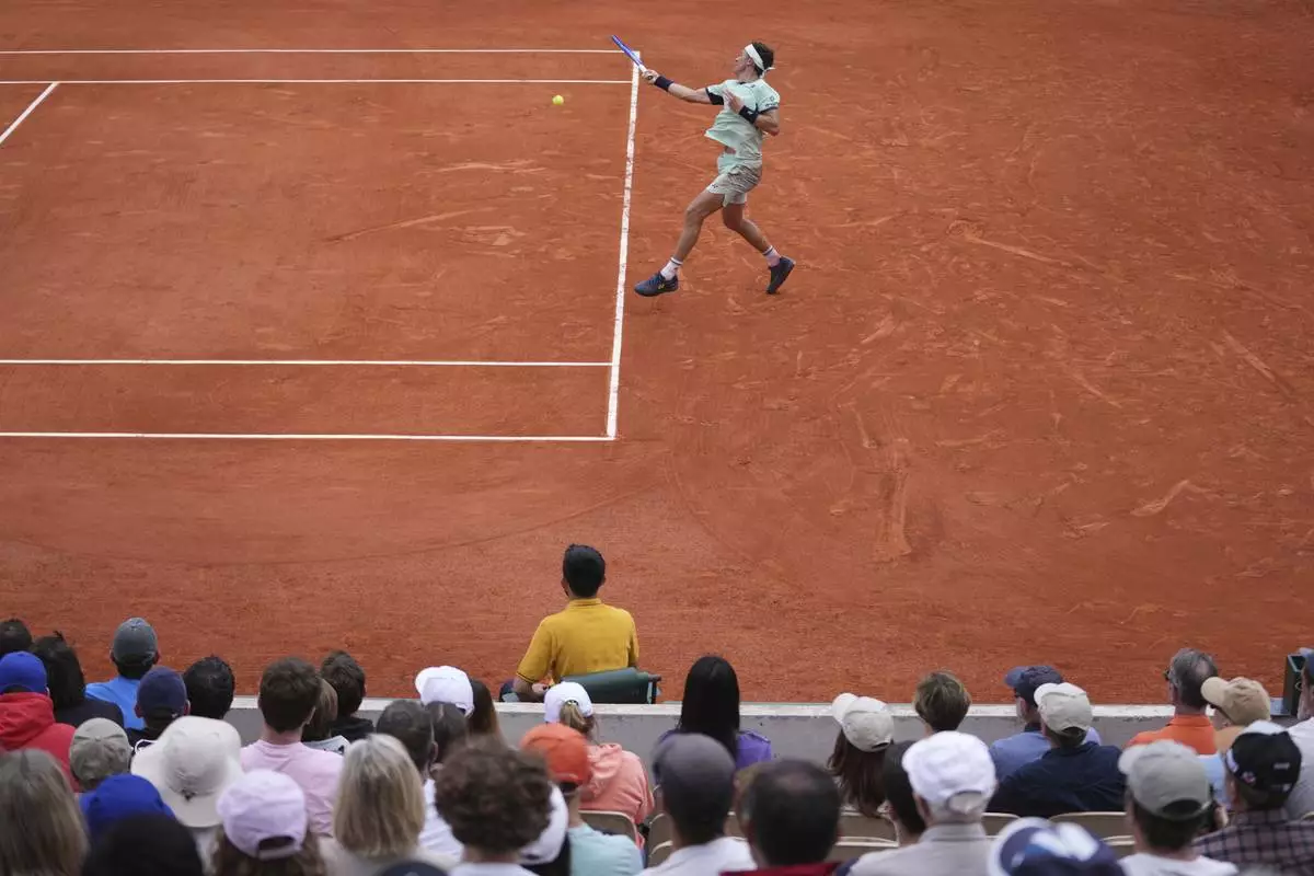 France's Arthur Fils returns the ball to Chile's Nicolas Jarry during their first round match of the French Tennis Open, at the Roland-Garros stadium, in Paris, Monday, May 26, 2025. (AP Photo/Lindsey Wasson)