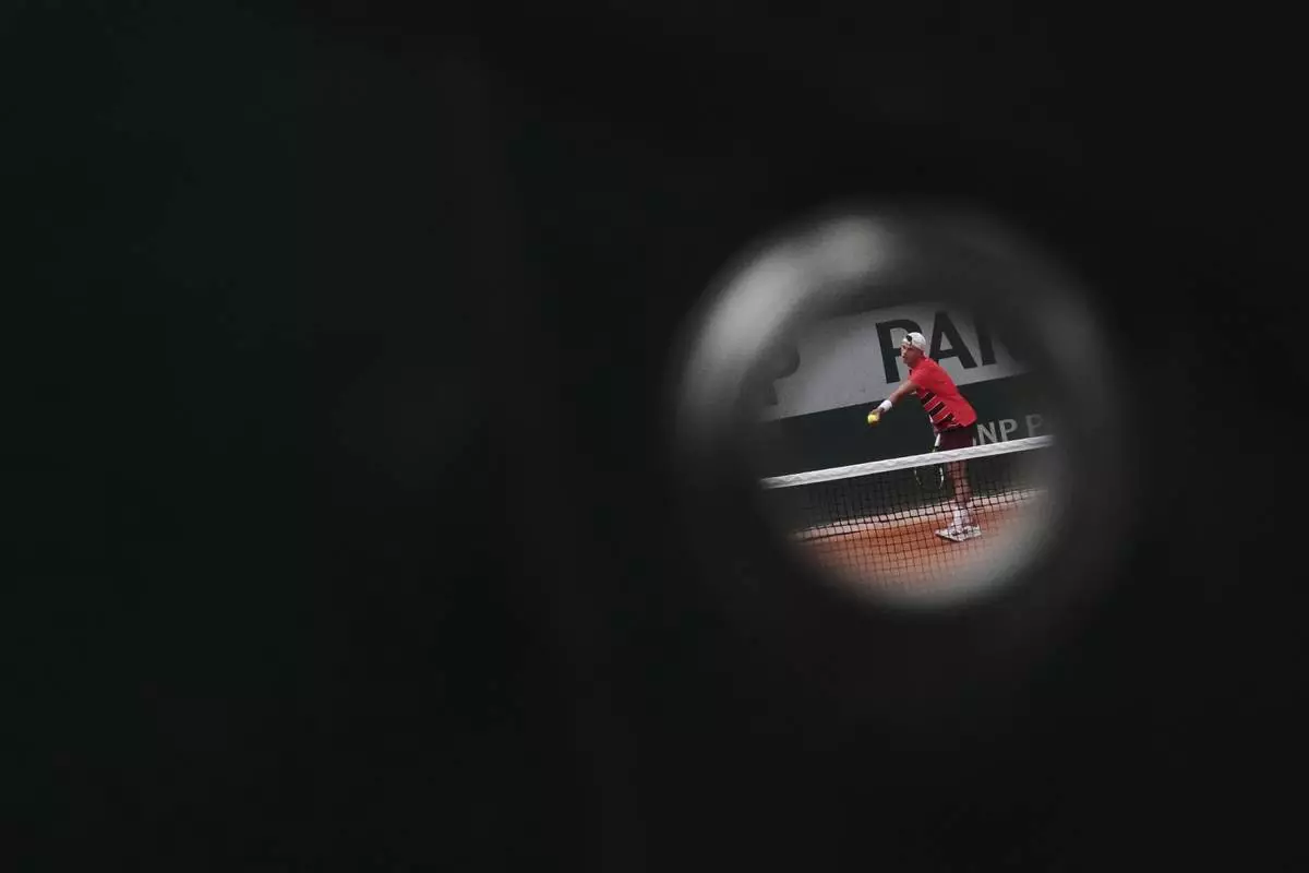 Denmark's Holger Rune is seen through a hole in a tarp on a fence as he prepares to serve a ball to Spain's Roberto Bautista Agut, during their first round match of the French Tennis Open, at the Roland-Garros stadium, in Paris, Monday, May 26, 2025. (AP Photo/Lindsey Wasson)