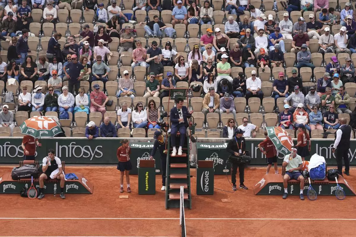 Spectators watch Spain's Paula Badosa playing Japan's Naomi Osaka during their first round match of the French Tennis Open, at the Roland-Garros stadium, in Paris, Monday, May 26, 2025. (AP Photo/Christophe Ena)