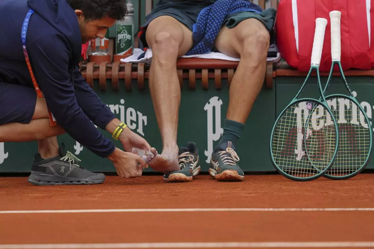 Australia's Alex De Minaur gets medical assistance as he plays Serbia's Laslo Djere during their first round match of the French Tennis Open, at the Roland-Garros stadium, in Paris, Tuesday, May 27, 2025. (AP Photo/Aurelien Morissard)