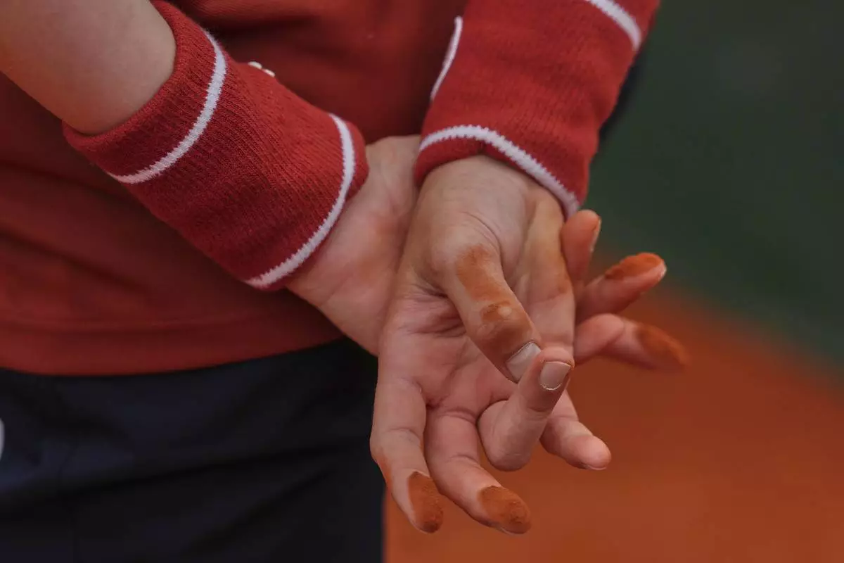 Clay lies on the hands of ball boy standing by a court during a first round match of the French Tennis Open, at the Roland-Garros stadium, in Paris, Tuesday, May 27, 2025. (AP Photo/Aurelien Morissard)