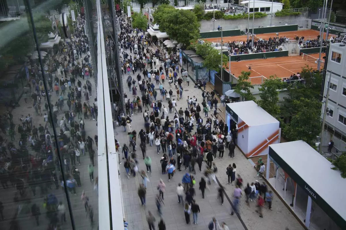Fans walk by the courts on the occasion of the French Tennis Open, at the Roland-Garros stadium, in Paris, Wednesday, May 28, 2025. (AP Photo/Christophe Ena)