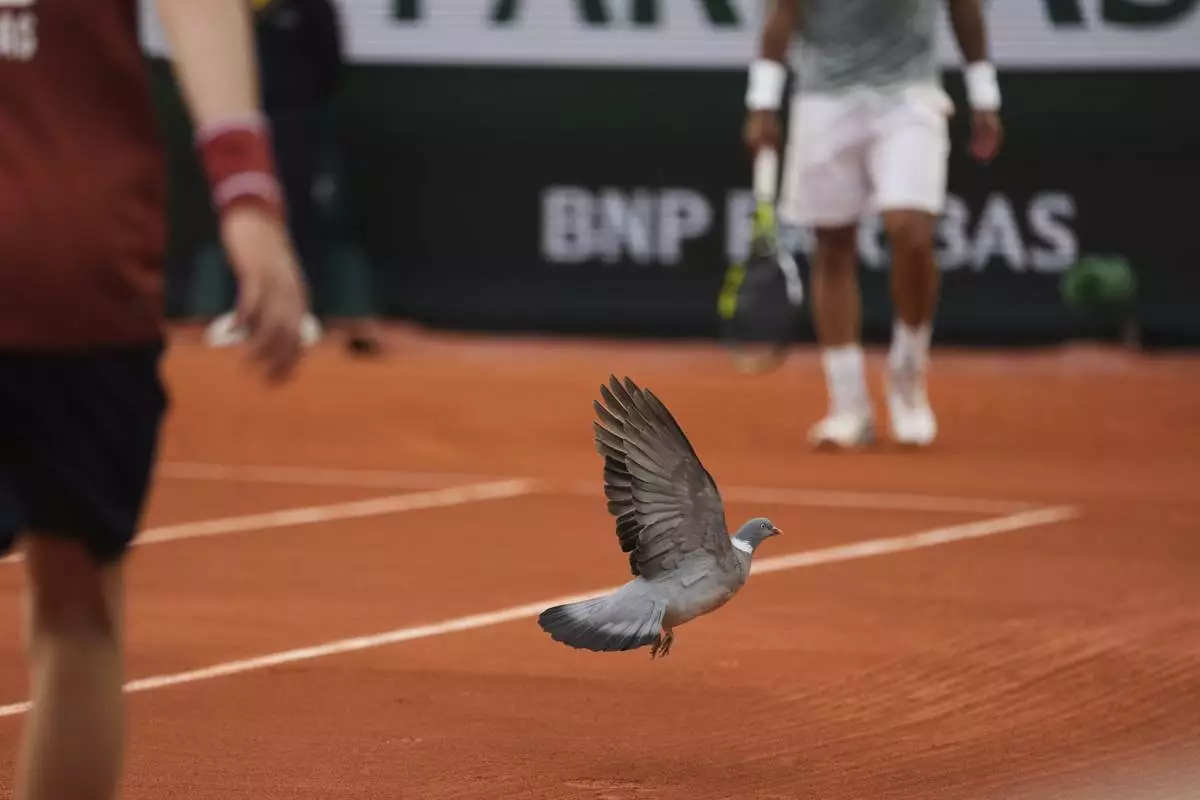 A pigeon flies over the Suzanne-Lenglen court during the first round match of the French Tennis Open between France's Arthur Fils and Chile's Nicolas Jarry, at the Roland-Garros stadium, in Paris, Monday, May 26, 2025. (AP Photo/Thibault Camus)