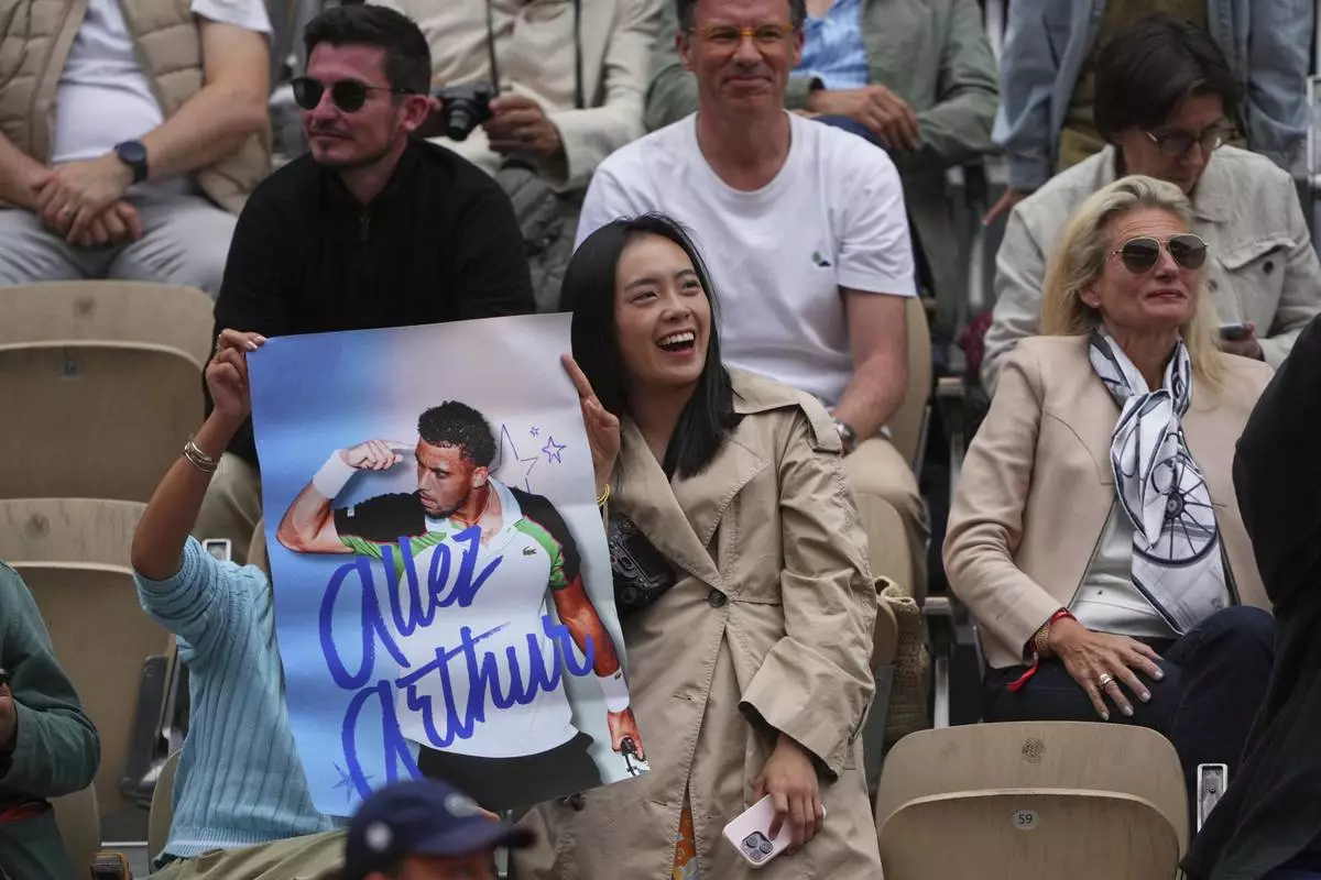 Fans cheer for France's Arthur Fils during his first round match of the French Tennis Open against Chile's Nicolas Jarry, at the Roland-Garros stadium, in Paris, Monday, May 26, 2025. (AP Photo/Lindsey Wasson)