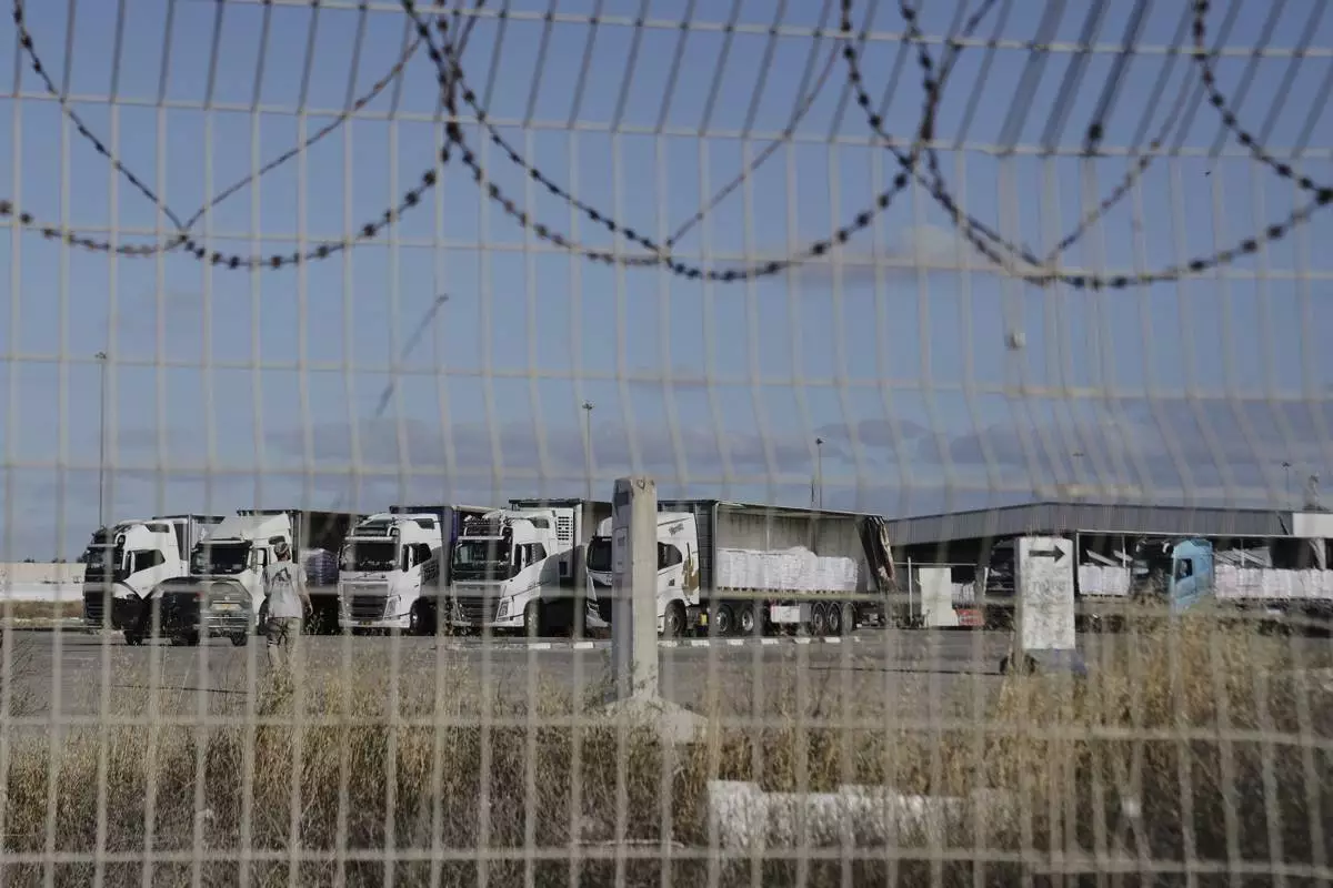 Trucks load with humanitarian aid for the Gaza Strip are seen at the Kerem Shalom Crossing in southern Israel, Tuesday May 20, 2025. (AP Photo/Maya Alleruzzo)