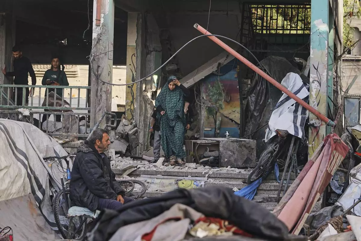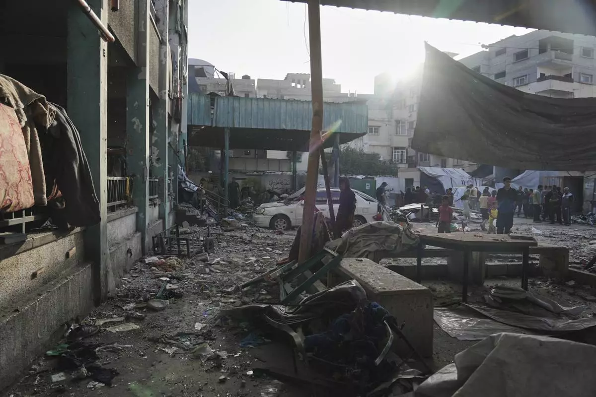 Palestinians inspect the damage at school used as a shelter by displaced residents that was hit by Israeli military strike and killed at least 36 people, in Gaza City, on Monday, May 26, 2025. (AP Photo/Jehad Alshrafi)
