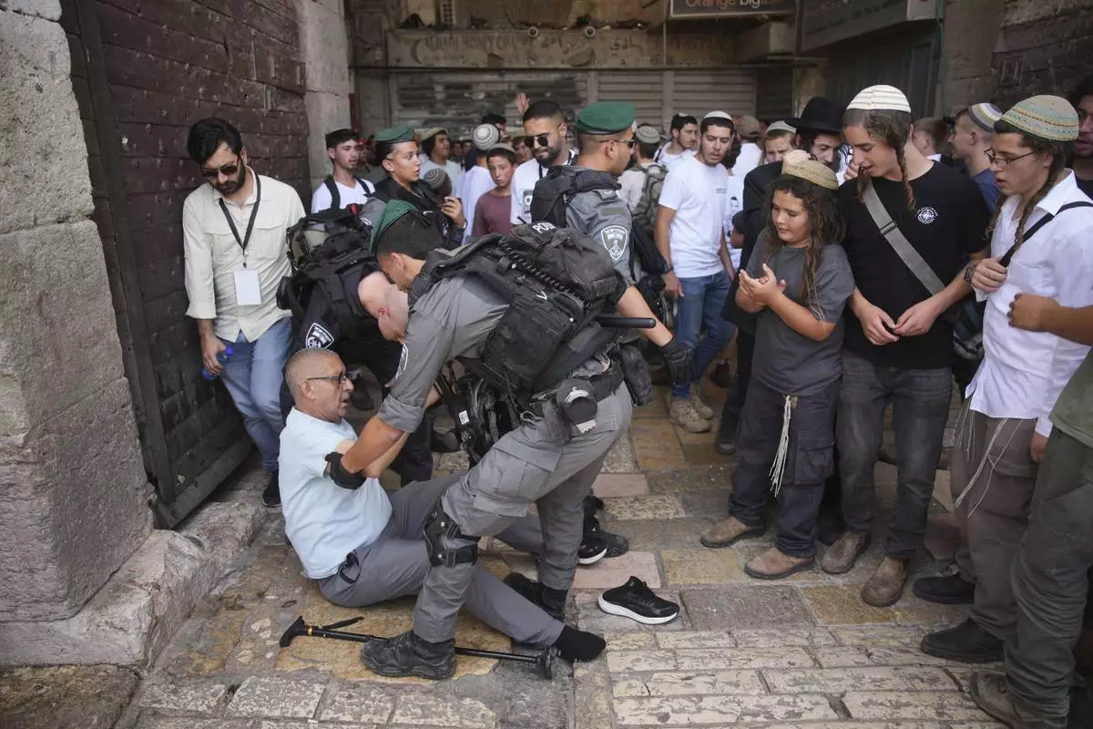 Israeli police officers assist a Palestinian man after he was pushed by Israelis as they mark Jerusalem Day, an Israeli holiday celebrating the capture of east Jerusalem in the 1967 Mideast war, in Jerusalem's Old City, Monday, May 26, 2025. (AP Photo/Ohad Zwigenberg)
