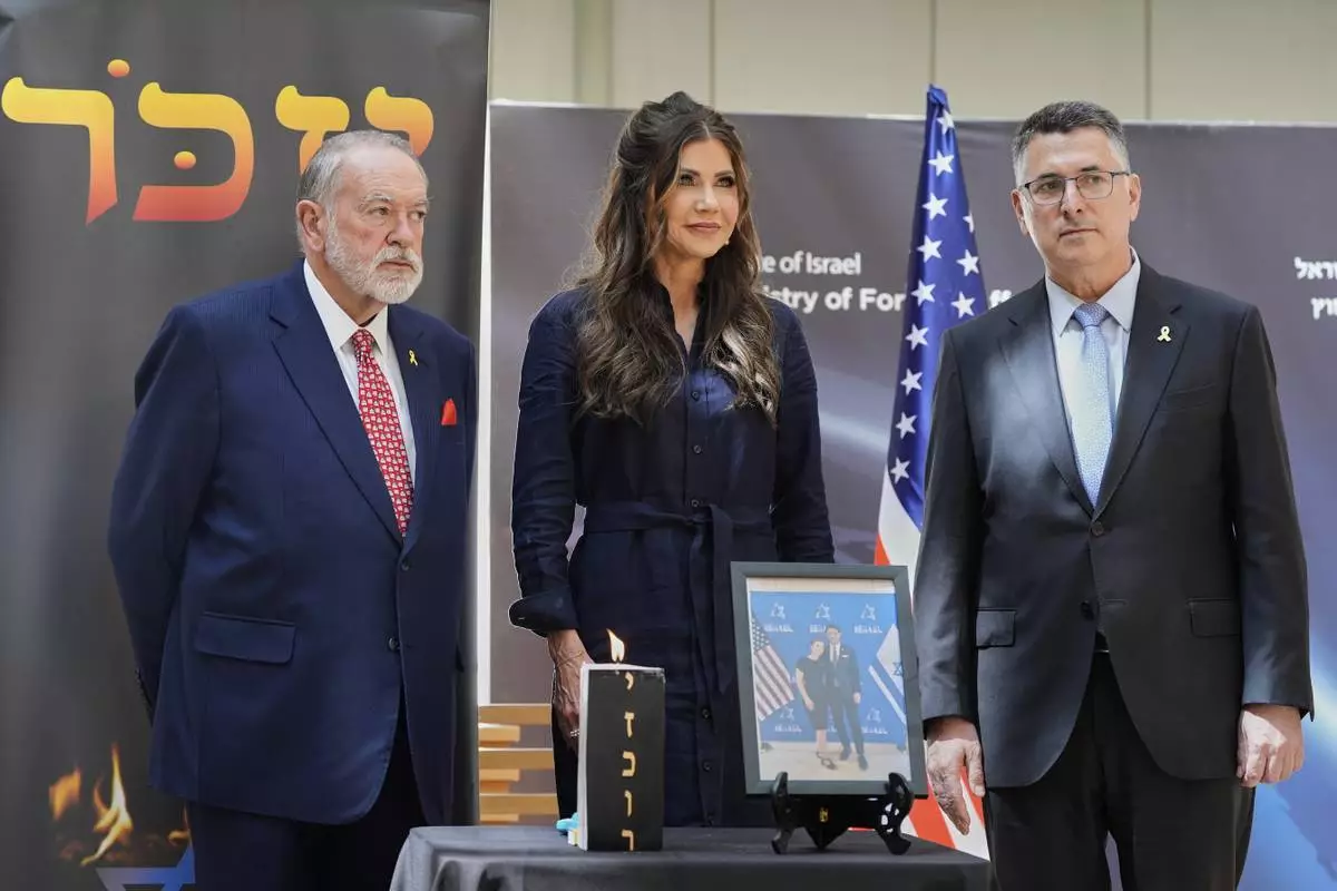 U.S. Homeland Security Secretary Kristi Noem poses for a photo with Israel's Foreign Minister Gideon Sa'ar and U.S. Ambassador to Israel Mike Huckabee during a memorial event honoring Yaron Lishinsky and Sarah Milgrom in Jerusalem, Monday, May 26, 2025. (AP Photo/Alex Brandon, Pool)