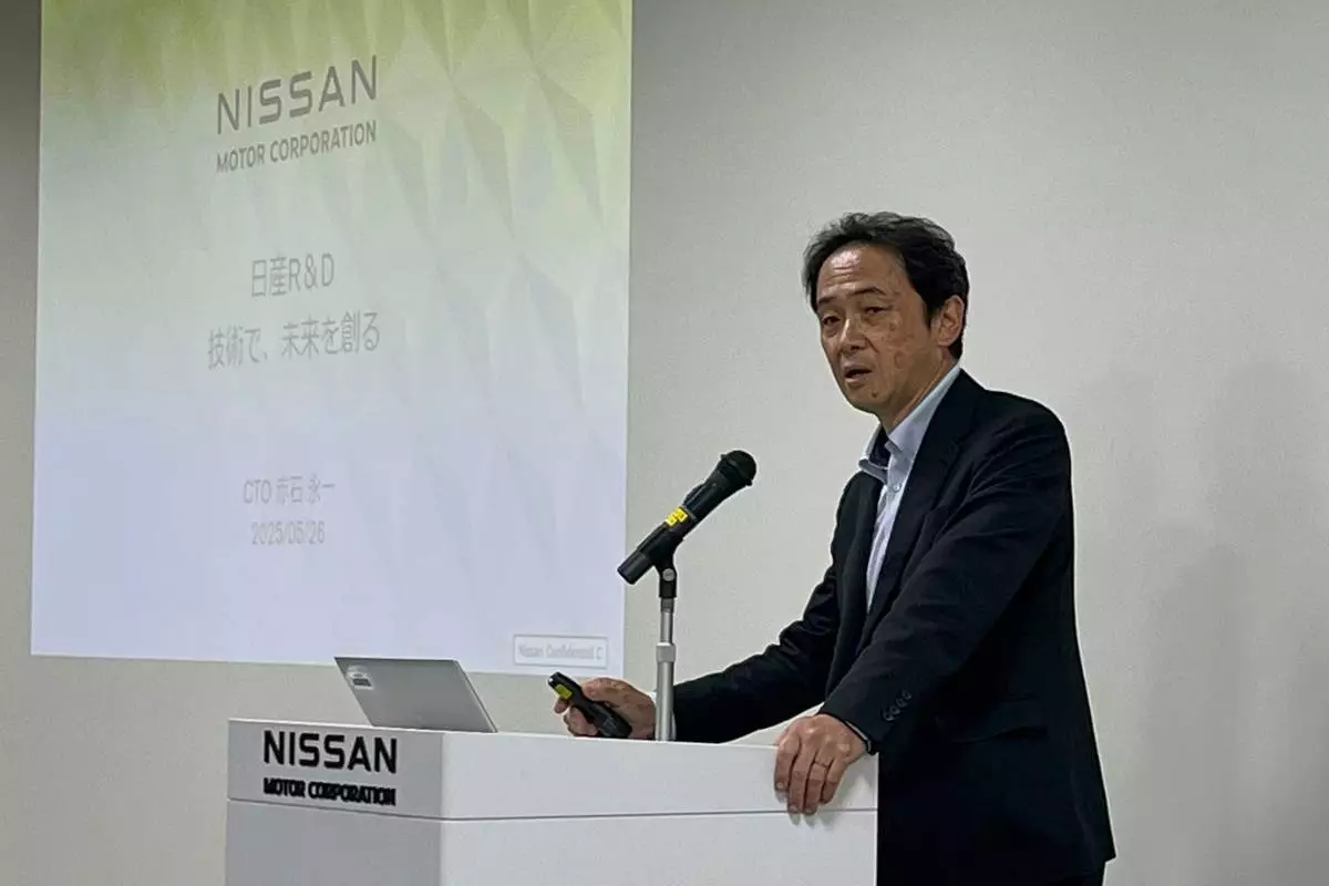 Nissan Chief Technology Officer Eiichi Akashi talks to reporters about their next-generation e-Power technology at the company’s Grandrive facility in Yokosuka, Japan, Monday, May 26, 2025. (AP Photo/Yuri Kageyama)
