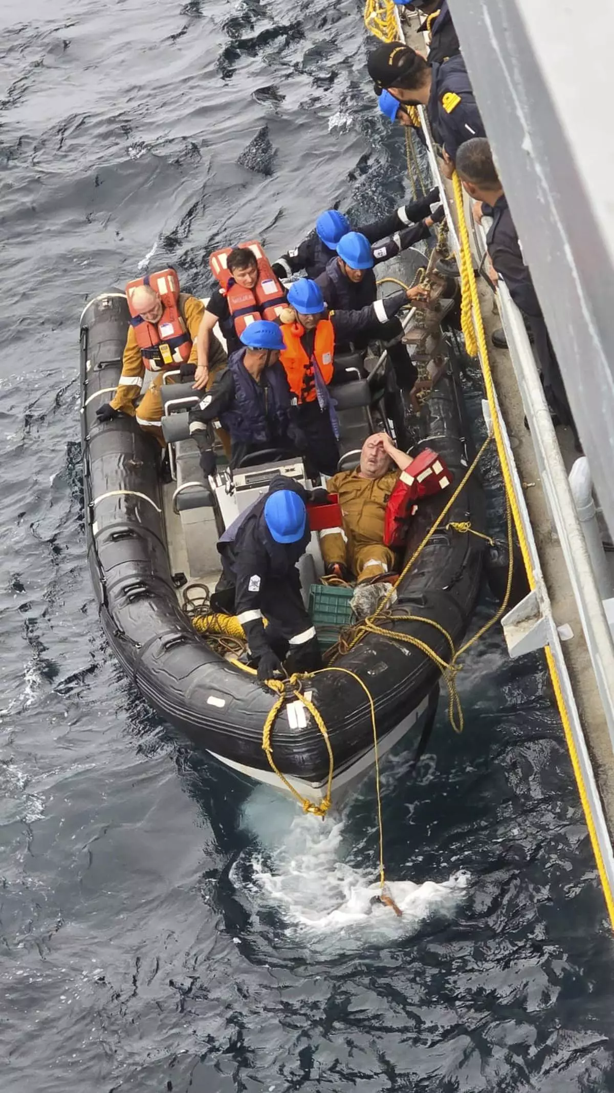 In this photo released by Indian Coast Guard, its members rescue crew members of the Liberia-flagged MSC ELSA 3, a container ship carrying hazardous cargo after it sank off Indian southern coast in the Arabian Sea Sunday, May 25, 2025. (Indian Coast Guard vis AP)