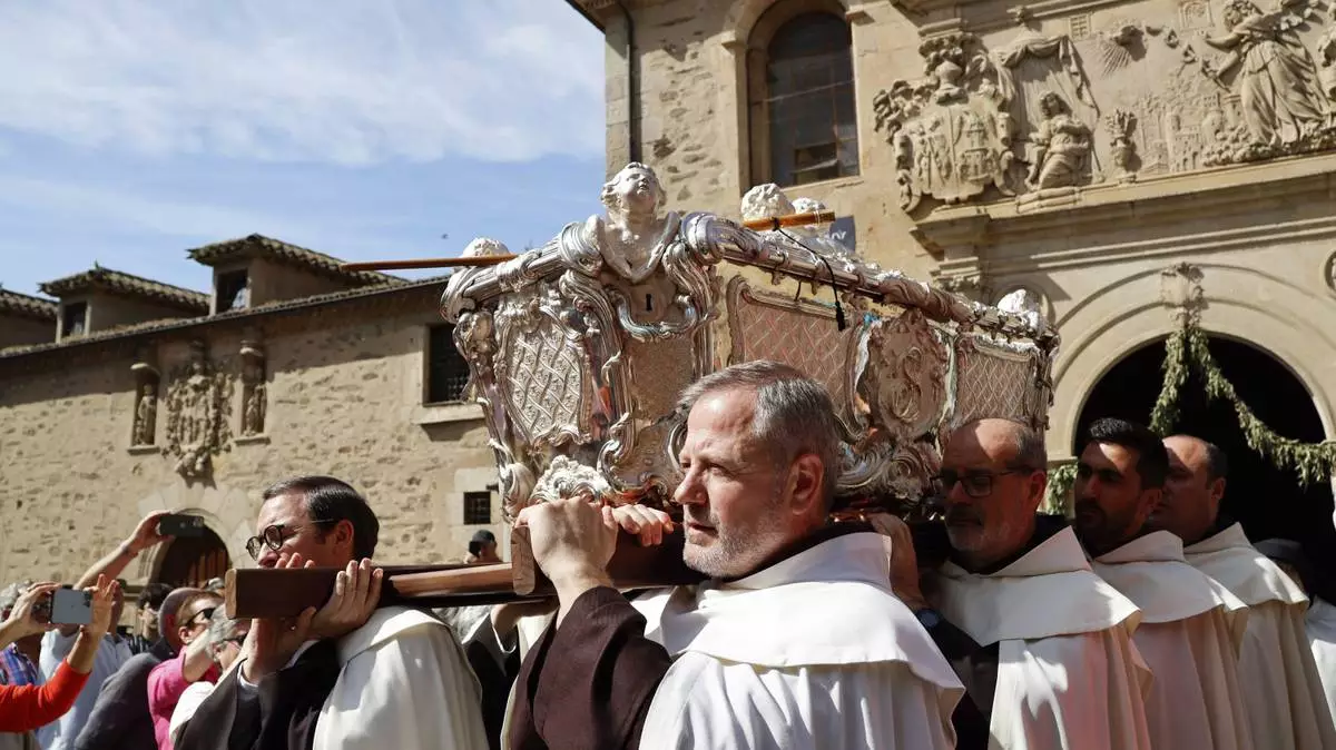 Religious carry in procession the casket containing the remains of Saint Teresa of Ávila, the Spanish saint, mystic, and 16th-century religious reformer, before her burial in Alba de Tormes, Salamanca, northwestern Spain, on Monday, May 26, 2025. (Manuel Ángel Laya/Europa Press via AP) **SPAIN OUT**