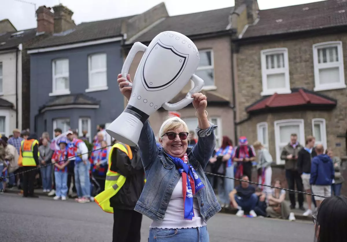Crystal Palace fans arriving before the FA Cup winners parade in London, Monday, May 26, 2025. (Yui Mok/PA via AP)