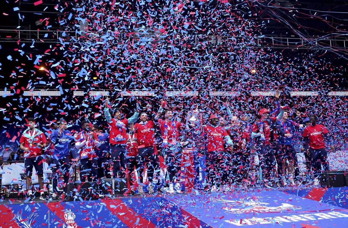 Crystal Palace players celebrate with the trophy on stage at Selhurst Park during the FA Cup winners parade in London, Monday, May 26, 2025. (Yui Mok/PA via AP)