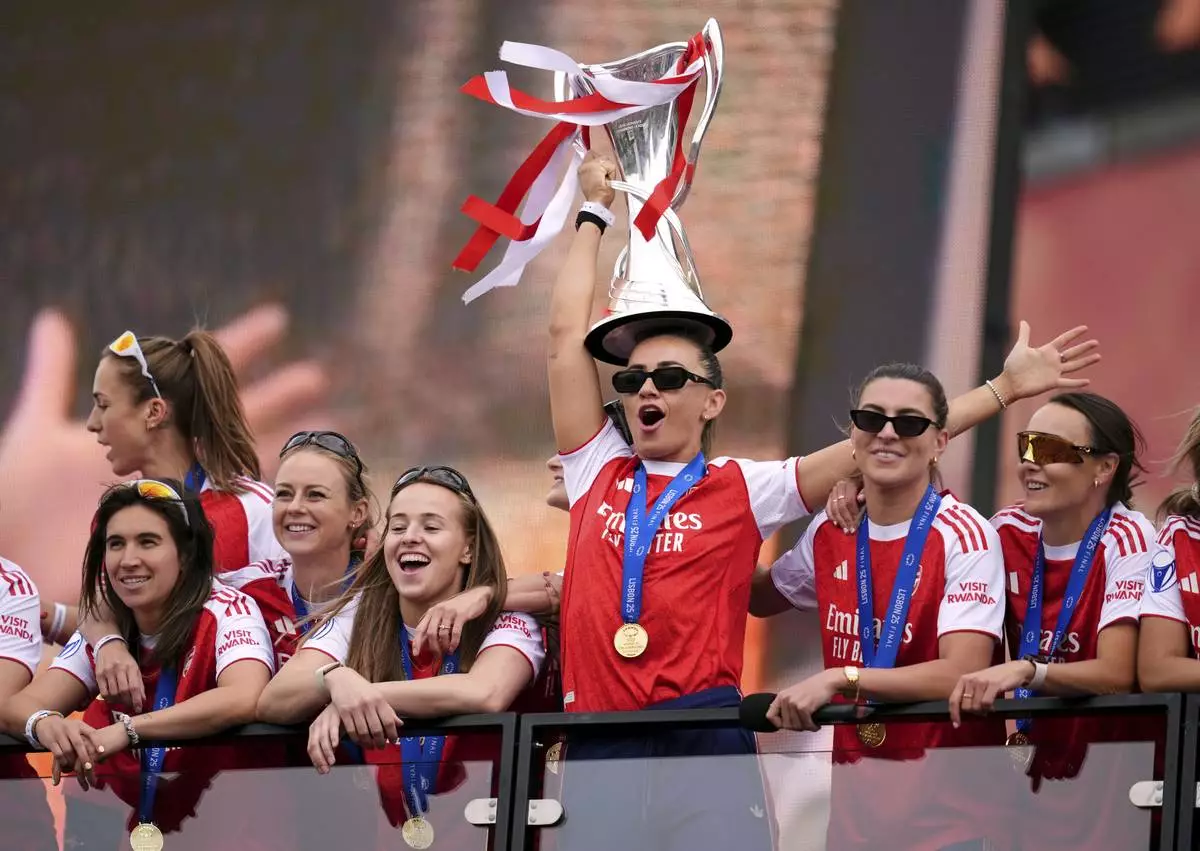 Arsenal's Katie McCabe holds the trophy during the Women's Champions League Winners parade in London, Monday, May 26, 2025. (Adam Davy/PA via AP)