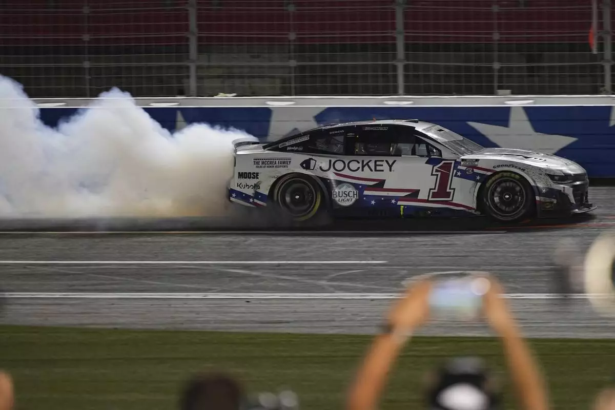 Ross Chastain does a burnout after winning a NASCAR Cup Series auto race at Charlotte Motor Speedway, Sunday, May 25, 2025, in Concord, N.C. (AP Photo/Matt Kelley)