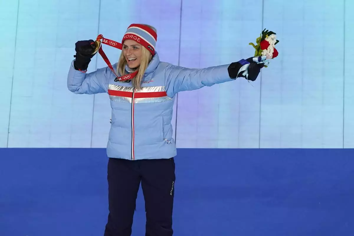 FILE - Gold medalist Therese Johaug, of Norway, poses during the medal ceremony for the women's 30km mass start free cross-country skiing at the closing ceremony of the 2022 Winter Olympics, Feb. 20, 2022, in Beijing. (AP Photo/Brynn Anderson, File)