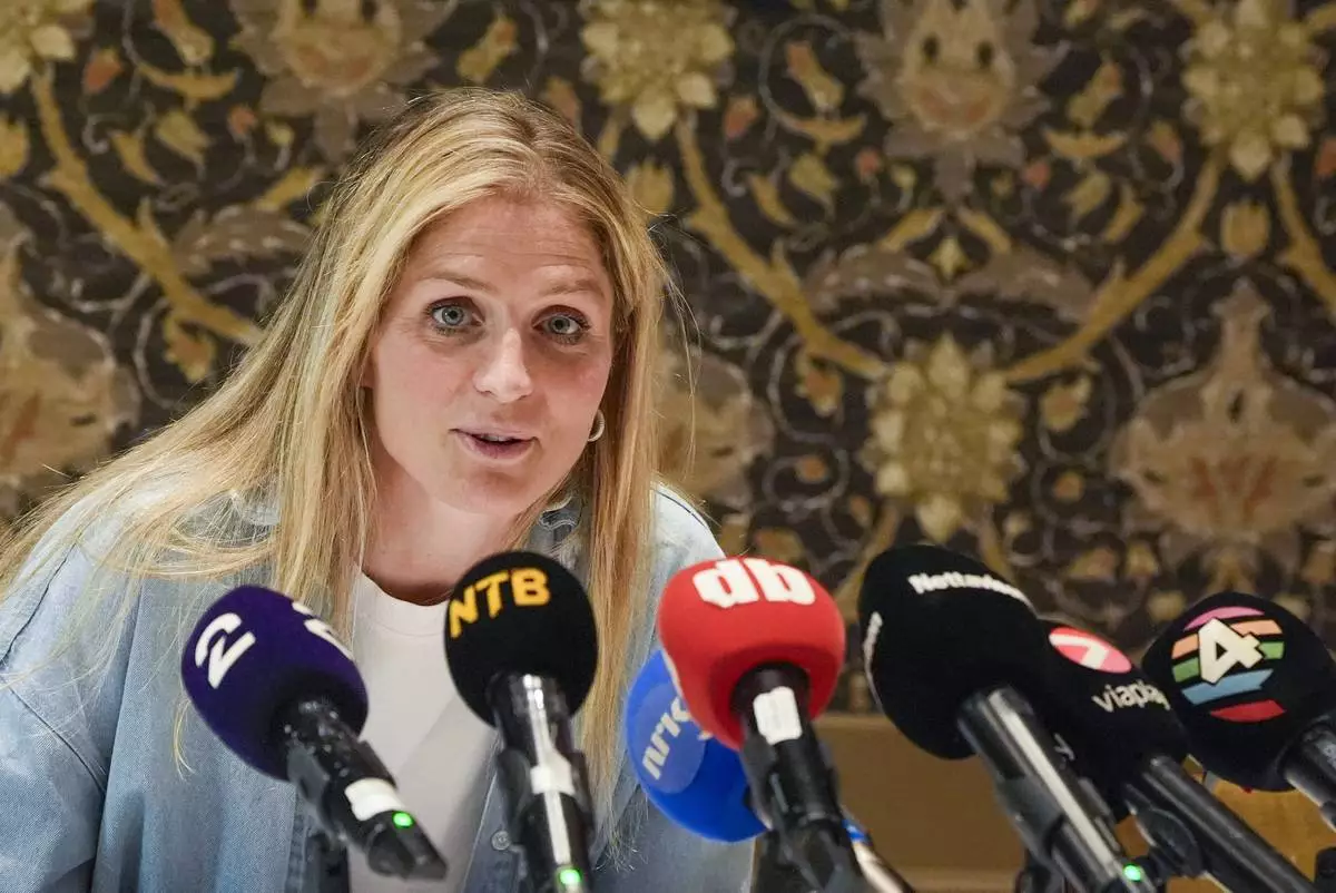 Norwegian four-time Olympic gold medalist Therese Johaug announces her retirement from cross-country skiing during a press conference at a hotel in Oslo, Monday, May 26, 2025. (Lise Åserud/NTB Scanpix via AP)