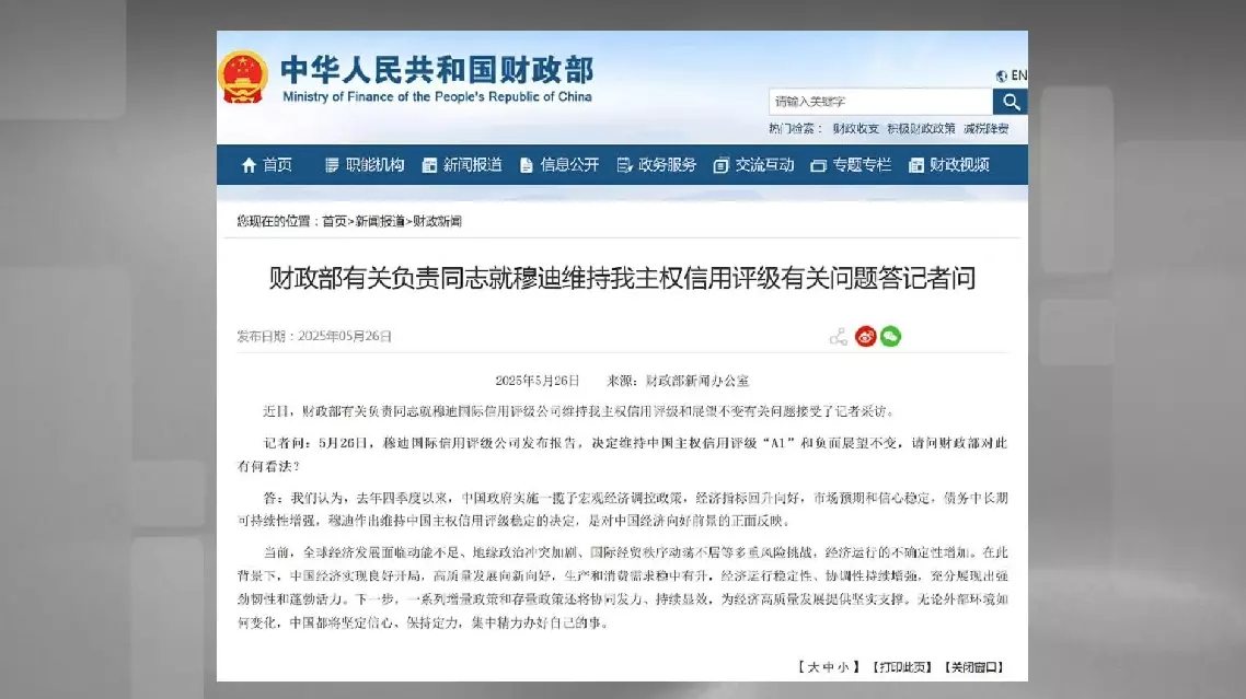 Ratings agency Moody's has affirmed its A1 rating on China's sovereign bonds, citing the country's push toward high-productivity sectors and potential gains in innovation efficiency.