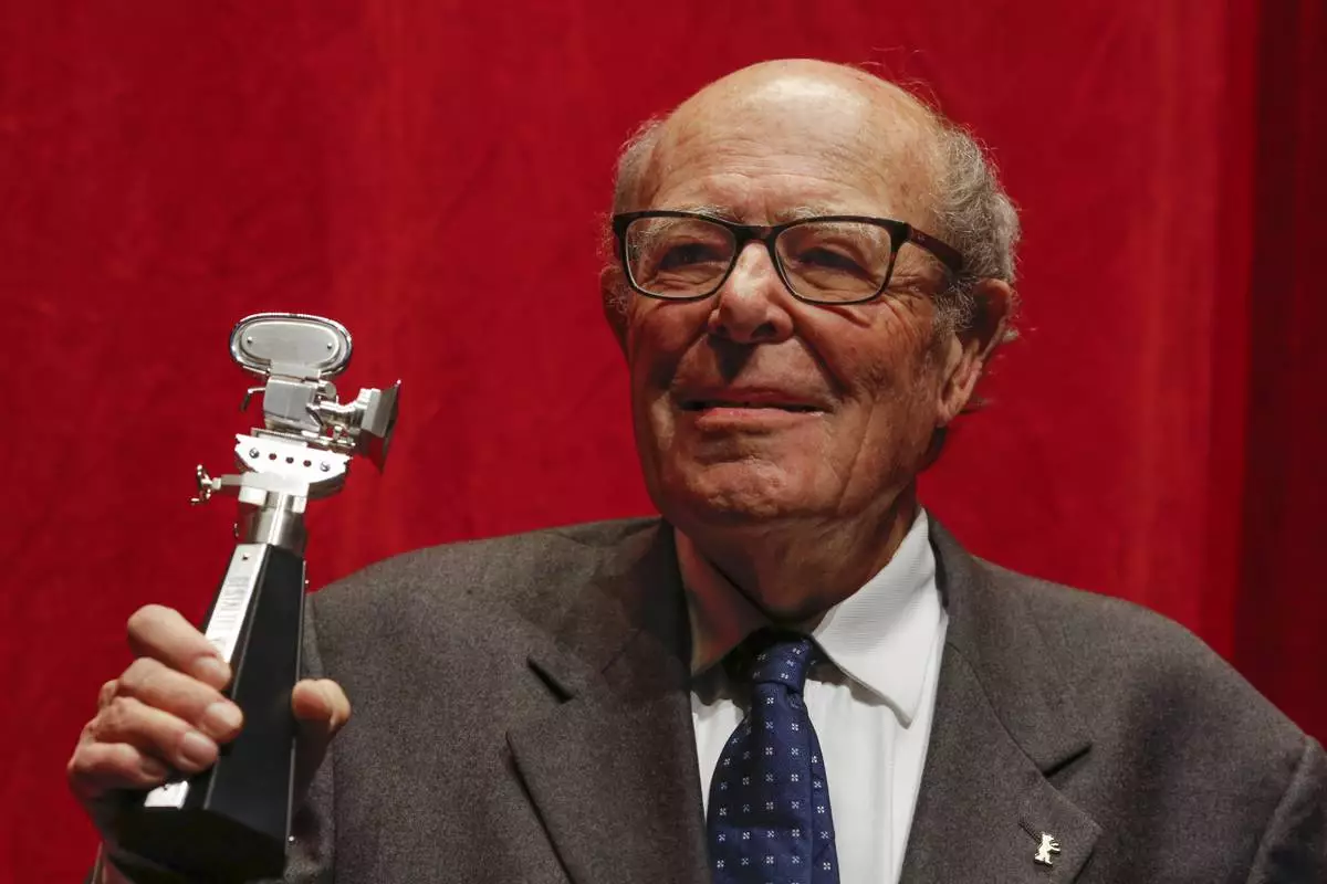 FILE - Director Marcel Ophuls shows the Berlinale Camera award after he is honored for his lifetime achievement during the 2015 Berlinale Film Festival in Berlin, Wednesday, Feb. 11, 2015. (AP Photo/Markus Schreiber, File)