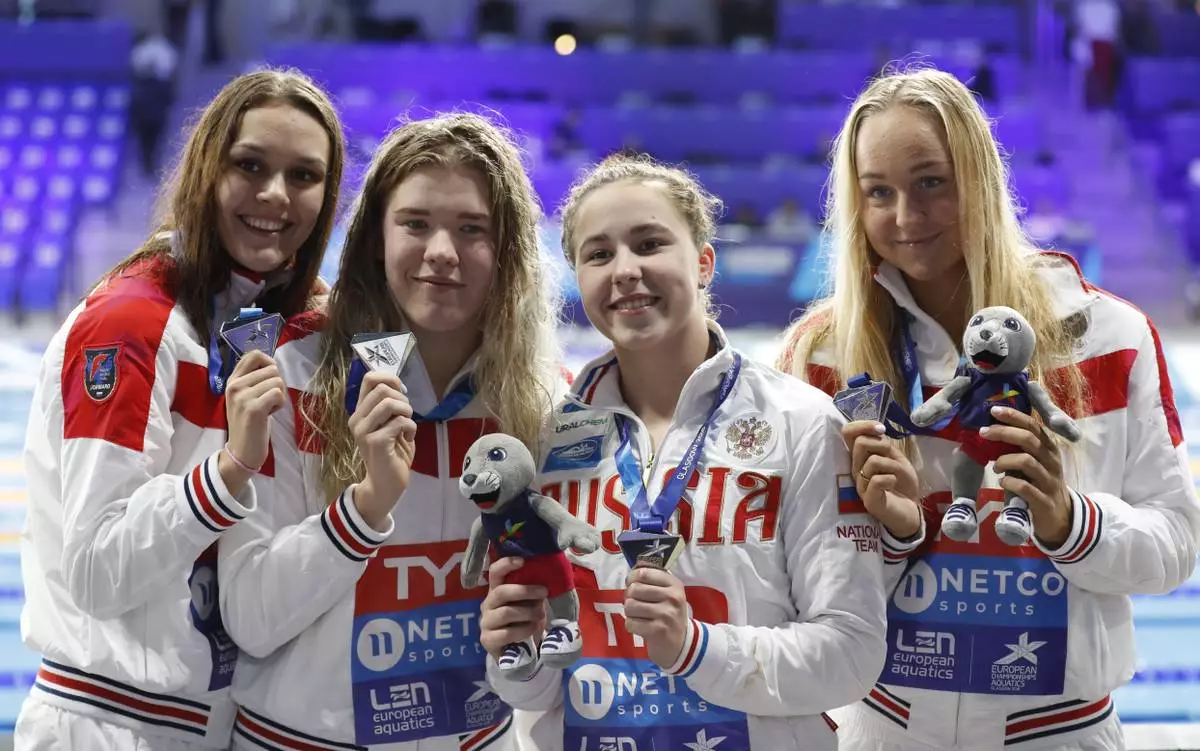 FILE - Russia's swimmers Valeriia Salamatina, Anastasia Guzhenkova, Arina Openysheva, Anna Egorova show off their silver medals for the women's 4 x 200m freestyle relay at the European Swimming Championships in Glasgow, Scotland, Aug. 7, 2018. (AP Photo/Darko Bandic, File)