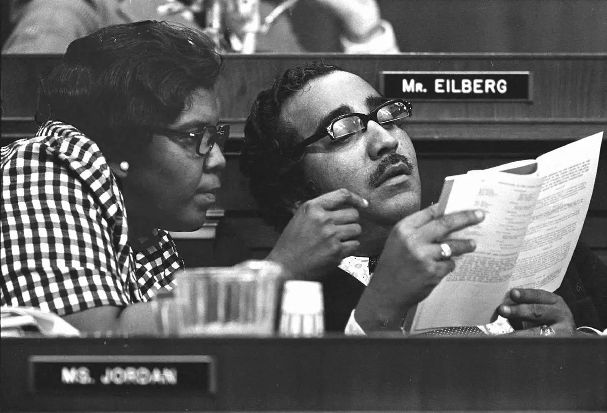 FILE - In this July 26, 1974 file photo, Reps. Charles Rangel, D-N.Y., and Barbara Jordan, D-Tex., left, look over a copy of the Constitution during a House Judiciary Committee debate on articles of impeachment for President Richard Nixon in Washington, D.C. (AP Photo/File)