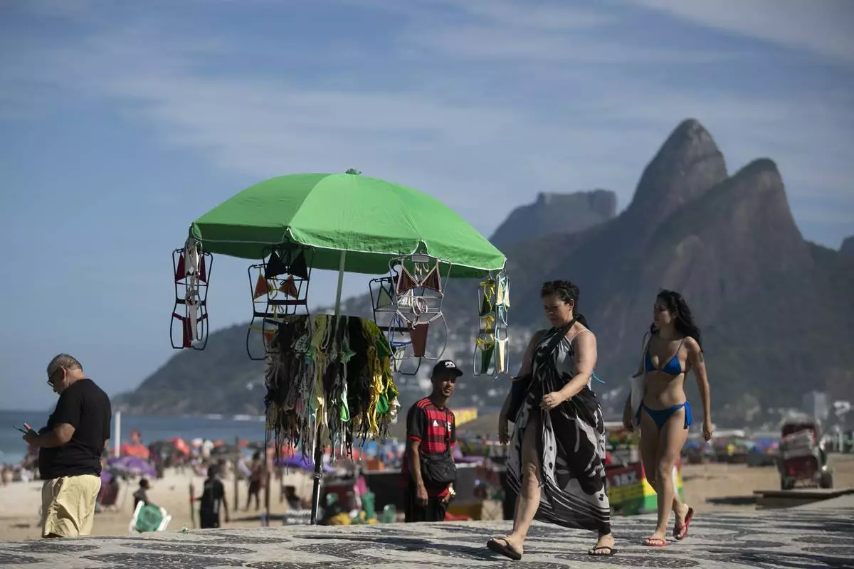 Beachgoers walk past a vendor's stand of beachwear on Ipanema Beach in Rio de Janeiro, Sunday, May 25, 2025. (AP Photo/Bruna Prado)