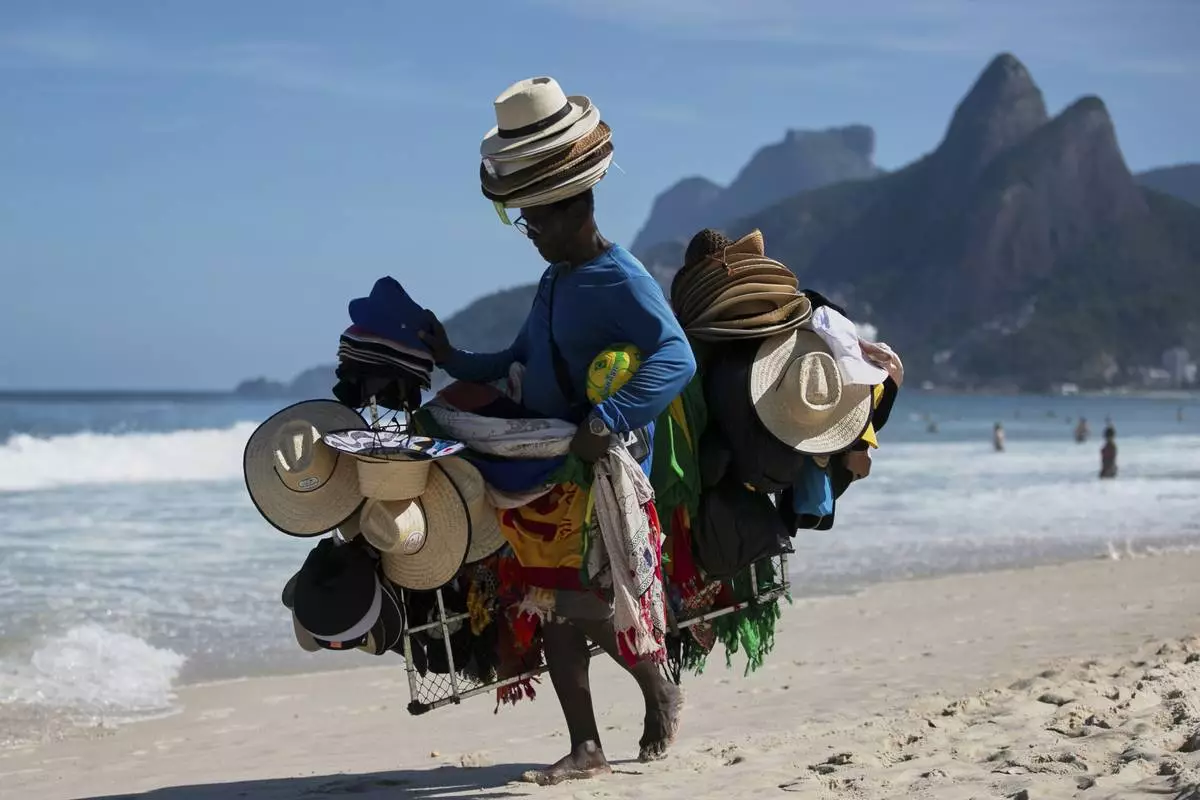 A vendor walks with his hats and beachwear along Ipanema Beach in Rio de Janeiro, Sunday, May 25, 2025. (AP Photo/Bruna Prado)