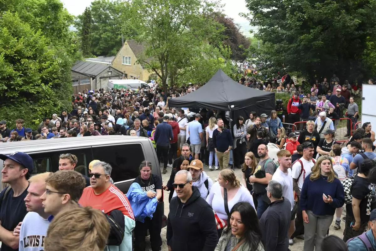 People queue for entry to the traditional annual Cheese Rolling contest at Cooper's Hill in Brockworth, Gloucestershire, England, Monday, May 26, 2025.(AP Photo/Anthony Upton)