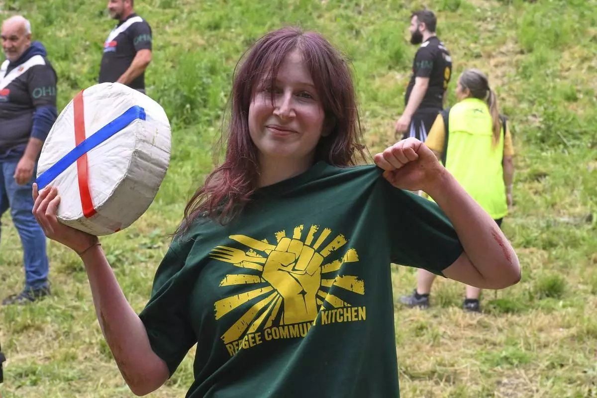 Ava Sender Logan shows the cheese roll after winning the women's downhill race category of the traditional annual Cheese Rolling contest at Cooper's Hill in Brockworth, Gloucestershire, England, Monday, May 26, 2025. (AP Photo/Anthony Upton)